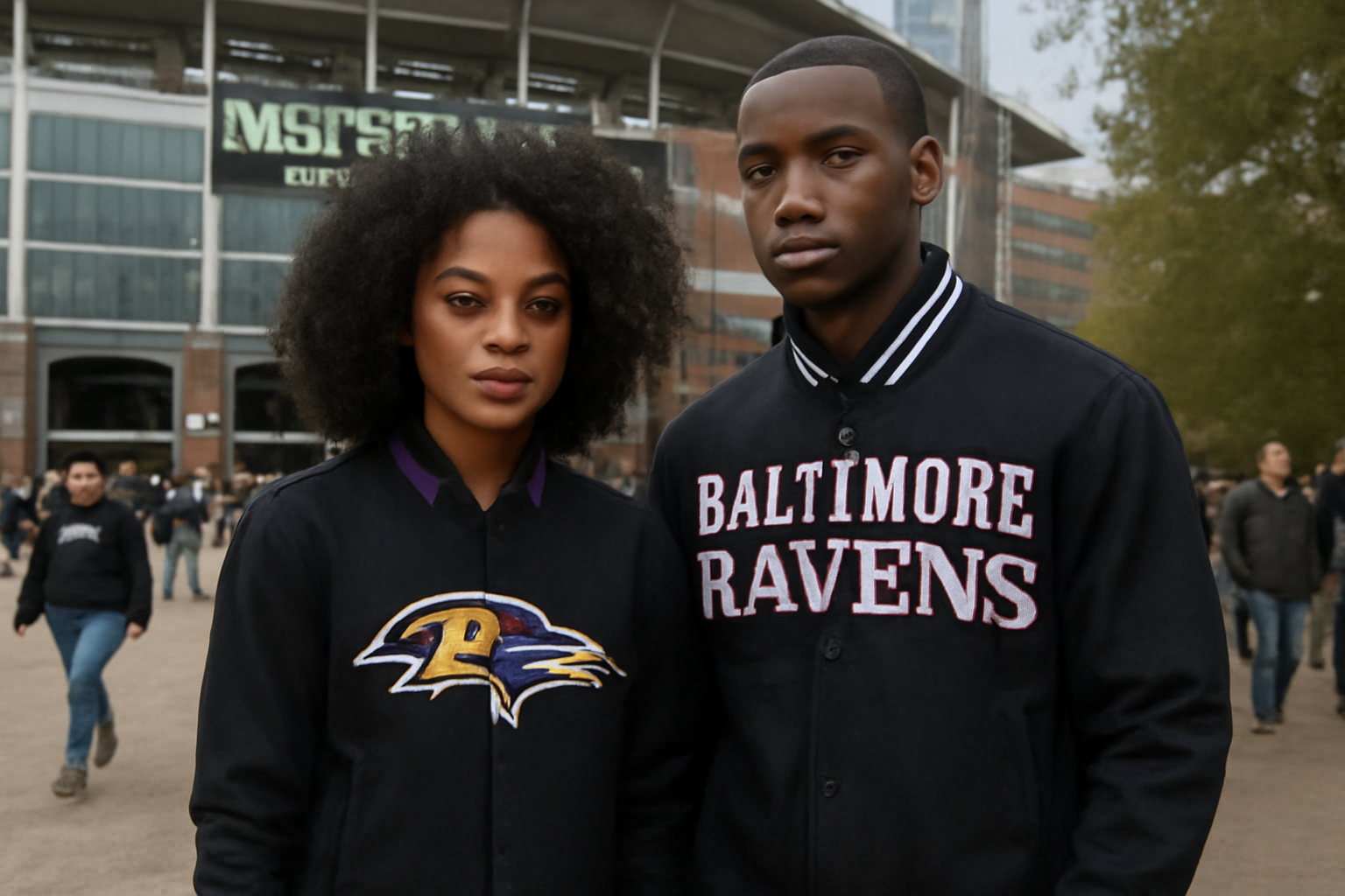 - Baltimore Ravens Black and White Varsity Jacket– Clean and timeless, this Ravens varsity jacket brings bold contrast and team pride in every stitch.