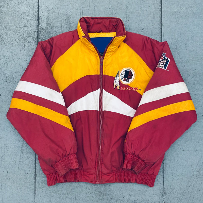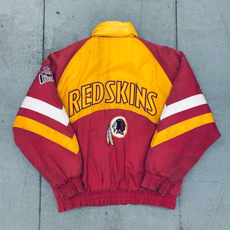 It has a stand-up collar that gives it a contemporary look and the full-length sleeves have stripes on them give it a vintage look. The cuffs are elastic so ensure a good seal to keep the cold out and warmth in. A zipper closure of 1990’s Washington Redskins Spellout Jacket is provided at front to make it easy to wear and take off.
