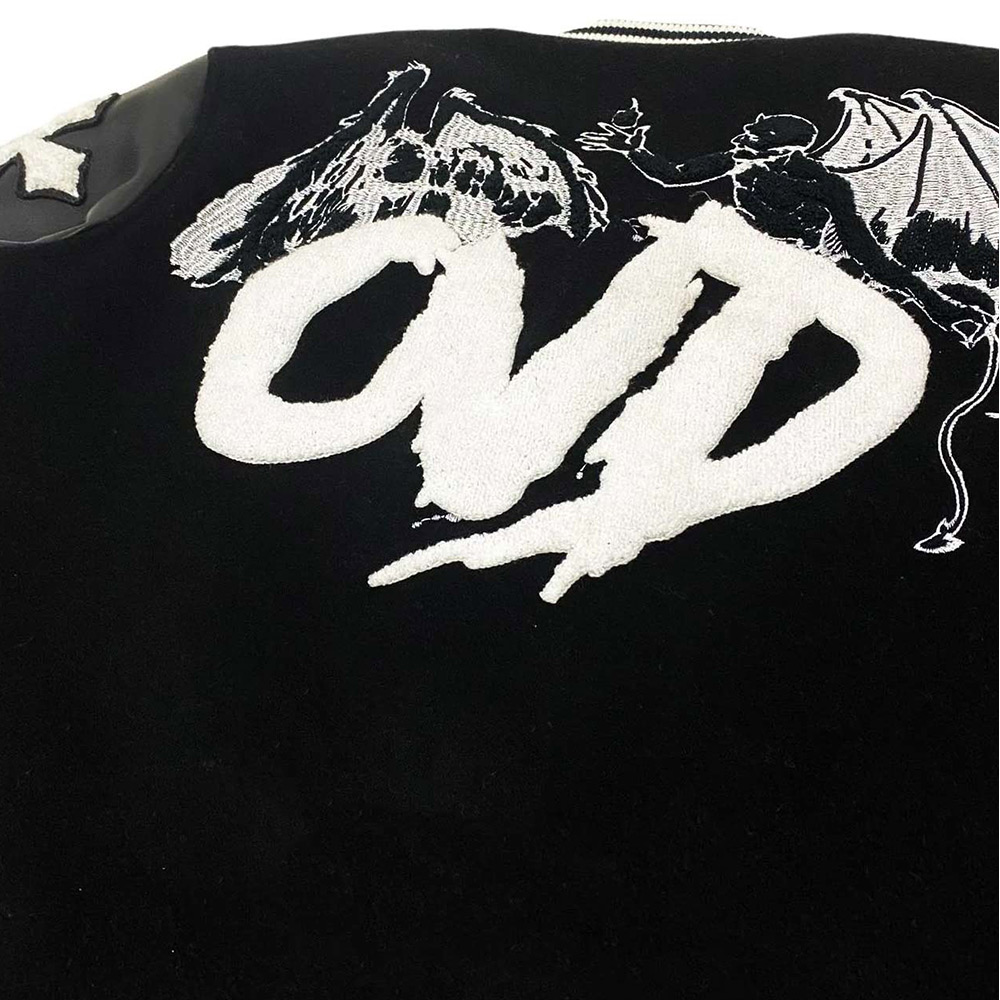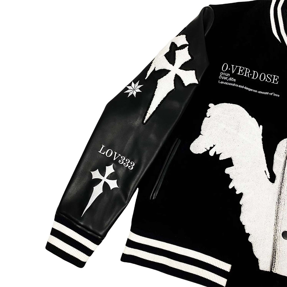 Fly into the urban scene with the Black O-Ver-Dose 777 Varsity Jacket. This streetwear masterpiece seamlessly fuses edge and sophistication, showcasing a sleek black design adorned with iconic 777 detailing. The OVD varsity jacket silhouette introduces a touch of classic charm, ensuring its versatility for street style enthusiasts. Tailored for those who value fashion with attitude, this jacket transcends its role as an outer layer; it’s a definitive statement piece that elevates your wardrobe. Whether navigating the city or hitting the streets with friends, flaunt your individuality and bold style with the O-Ver-Dose 777 Varsity Jacket.