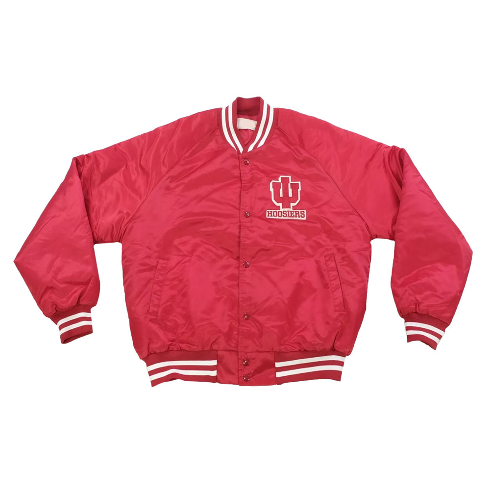 Audaciously dive into the 80s with the Indiana Hoosiers 80s Jacket that comes in sizes for both males and females. This fabulous jacket is designed for the fans of the legendary 80s football and basket ball team. This Indiana Hoosiers 80s Jacket is crafted from satin and comes with a combined viscose lining and so can be regarded as comfortable as well as durable. It gives an eye-catching red hue with accents of rib-knit trims on the collar, cuffs, and hem that gives it a slim, comfortable fit. It has full-snap buttoned closure provides you with the ease of wearing the jacket as well as the fashionable look for the display of your team pride. Having a classic straight line with loose fitting long sleeves and a large embroidered Hoosiers logo on the front, this Indiana Hoosiers 80s Jacket comes with all the hoopla.