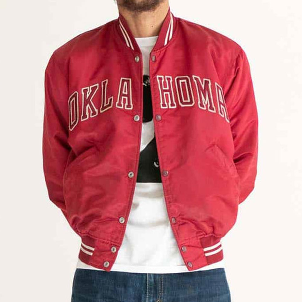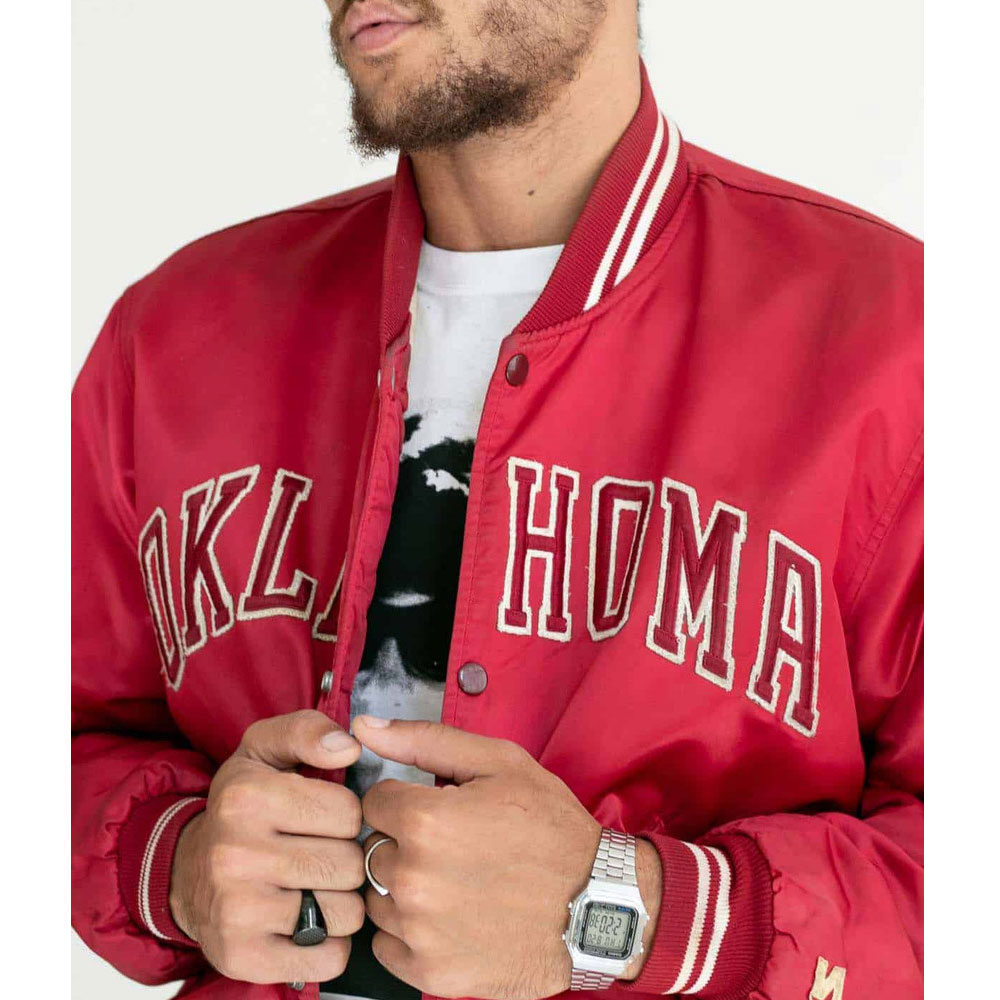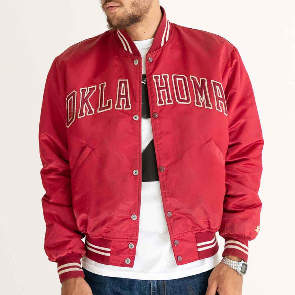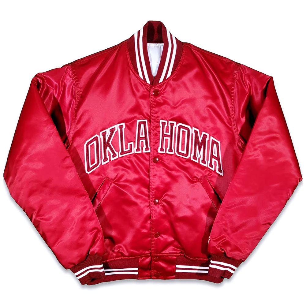 Step into the past with the 80s Oklahoma Sooners Jacket, expertly crafted from sumptuous satin. Available in a strikingly chic red hue, this jacket exudes a distinct sense of style. The Oklahoma Sooners 80s Jacket boasts a rib-knitted collar and a front buttoned closure, effortlessly merging retro charm with modern convenience. Wrapped in a soft viscose lining, the inner cocoon ensures utmost comfort. The jacket proudly displays an embroidered logo on the front, adding to its unique appeal. The elongated, well-fitted sleeves, accompanied by rib-knitted cuffs, promise a sleek silhouette. For functionality and allure, two spacious side waist pockets elegantly integrate practicality. Impeccable stitching ensures the jacket’s lasting durability. Perfect for a night out, the 80s Oklahoma Sooners Jacket captures the essence of timeless style, embraced by both fashionable men and women.