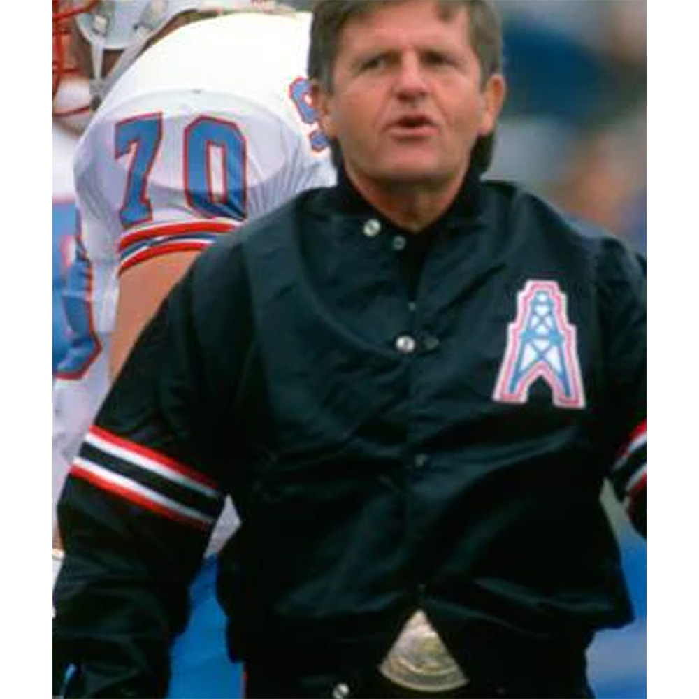 Answer the call to transcend the ordinary with the Houston Oilers 90s black jacket. The fusion of athleticism and elegance is impeccably realized through meticulous craftsmanship: opulent satin, revealing an enchanting black color that radiates individuality. A dance of sophistication unfolds as the rib-knitted collar meets the iconic snap-tab button closure, intertwining style, and self-assuredness. Its innovative design births a bold opus, marking it as the ultimate selection for spirited gatherings with friends. The 90’s Houston Oilers black jacket’s elongated sleeves are lovingly held by rib-knitted cuffs, flawlessly blending comfort, and audacity. Enveloped in the plush hug of a viscose inner lining, experience both warmth and serenity. Meanwhile, utilitarian waist pockets and concealed inner compartments stand as an elegant sanctuary for your essentials.