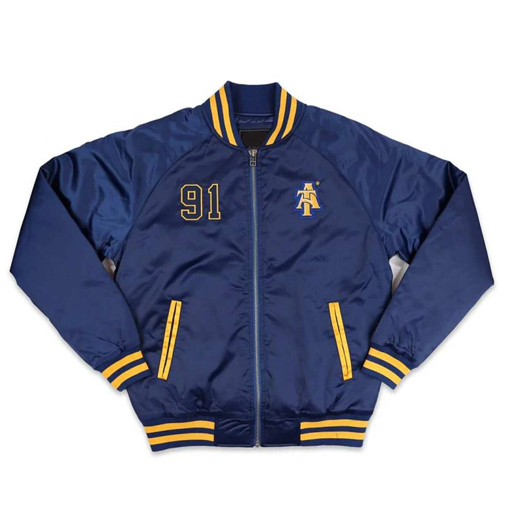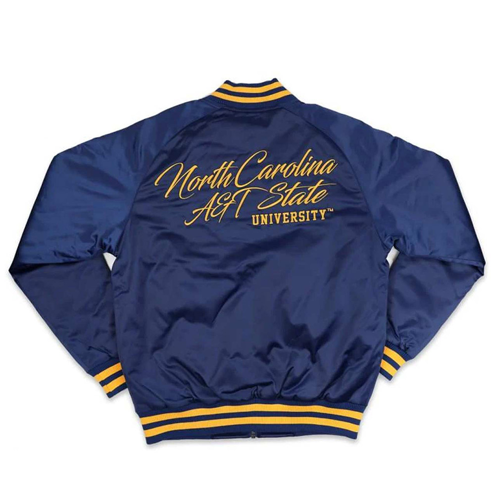 Embark on a voyage of refined style with the North Carolina A&T Baseball jacket, a meticulously crafted masterpiece of polyester fabric that epitomizes excellence. This jacket features a rib-knit collar and snap tab buttoned front closure, seamlessly merging function with high fashion, reshaping your style presentation. Envelop yourself in the plush cocoon of the viscose inner lining, cocooned in opulent comfort. Elongated sleeves, adorned with sleek rib-knit cuffs, add an enchanting touch, lifting your elegance to unparalleled heights. Enhanced by an inner pocket and two outer pockets, the 91 North Carolina A&T Navy jacket embodies practical refinement. Revel in unmatched comfort and allure, as meticulous stitching pays homage to unparalleled craftsmanship. A symbol of sophisticated gatherings, this North Carolina A&T Baseball jacket mirrors your dynamic spirit and establishes a new standard for trendsetting brilliance an emblem of your unique style vision.