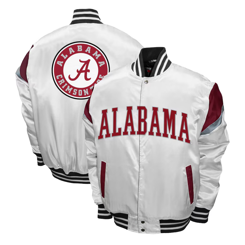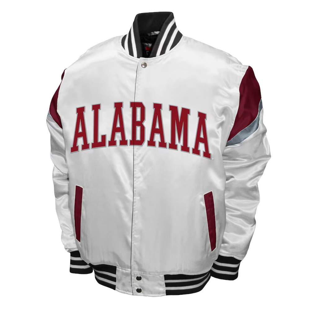 It is made from high-quality satin and has a viscose lining inside to make it comfortable and long lasting. The collar and cuffs are ribbed to ensure the Alabama Crimson Tide Power white satin Jacket stays in place well, and the full length fitted sleeves give it a tailored finish. In a bid to add sporty appearance to the design of the jacket, the sleeves contain stripes which give it a lively look.