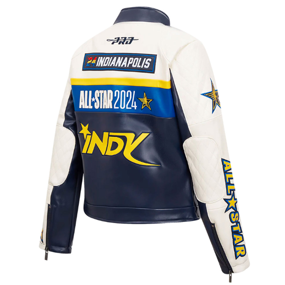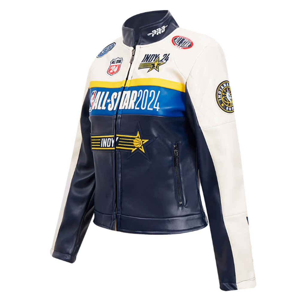 The design of the All-Star Game 2024 Eggshell/navy Leather jacket includes two zippered pockets on the waist that allows you to have a place to put your belongings and the internal pocket is also a plus. It is considered a statement piece because of logos on the front which make it very suitable for displaying your support to the NBA and the Pacers.