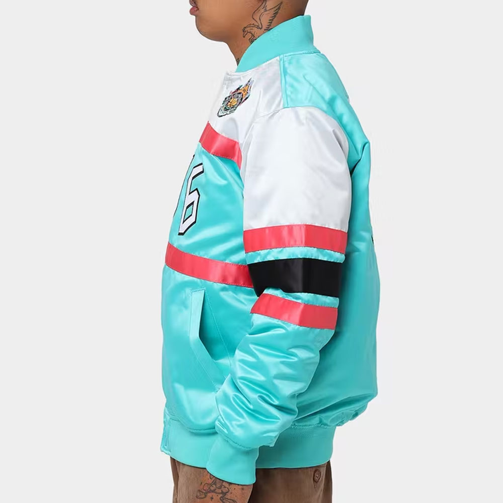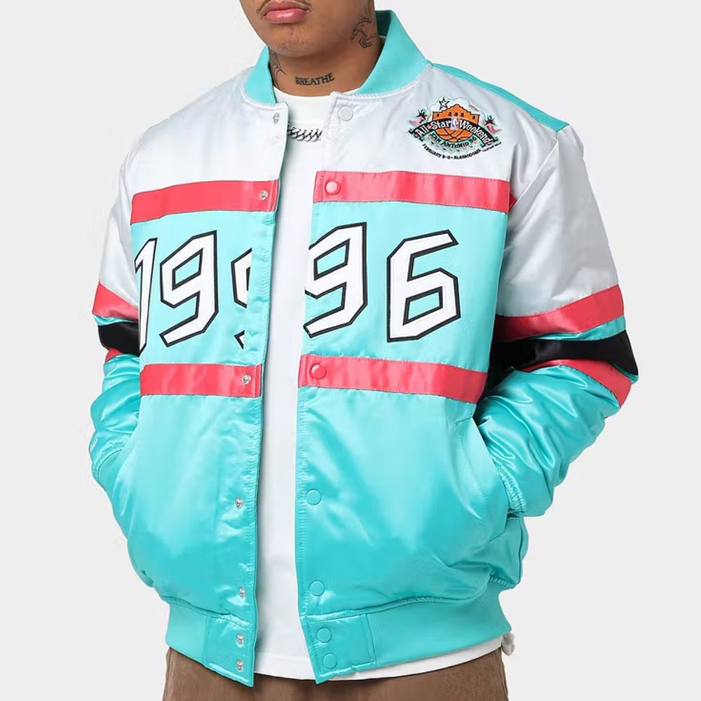 The Hardwood Classics All-Star NBA Weekend 1996 jacket is made up of high-quality satin. The jacket is available in a majestic green color, which gives it an innovative and enchanted look. The jacket has rib knitted collar. The jacket has buttoned front closure. A soft inner viscose lining of the jacket keeps you warm and relaxed. The sleeves of Hardwood Classics 1996 All-Star NBA Weekend Teal jacket are long with buttoned cuffs. The jacket has two inner and two side pockets. The fine quality stitching of Hardwood Classics All-Star NBA Weekend 1996 jacket makes it durable and desirable to wear. The jacket is an ideal choice to wear in parties.
