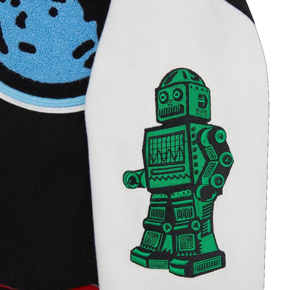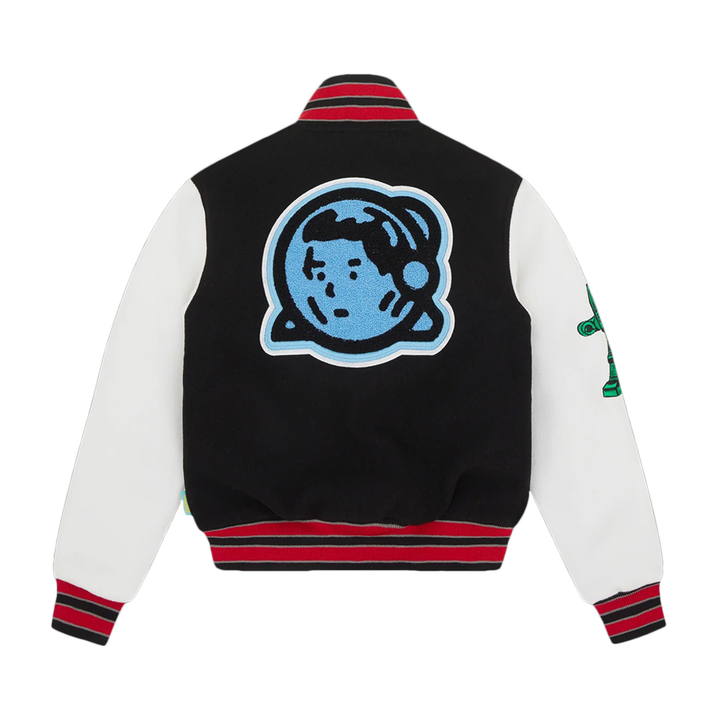 The black color has been used to give this jacket a very bold look and feel while the ribbed collar, cuffs and hem line give it a more fitted varsity look. The sleeves of the Astro BBC Chenille Logo Varsity Jacket come with some cool patches which are an excellent detail on the outfit. There is a snap tab closure at the front for ease of wear and can be worn over a t-shirt or a hoodie.
