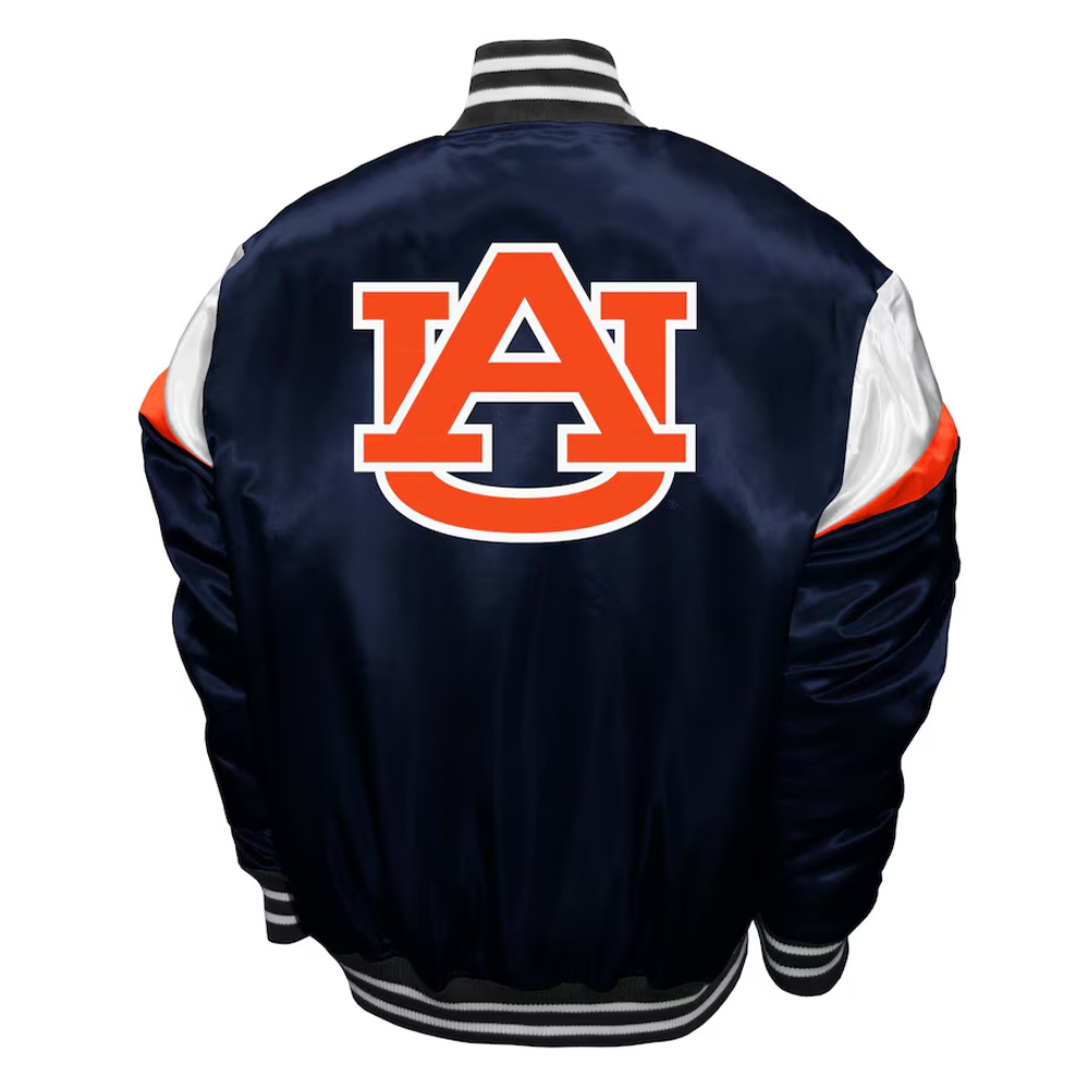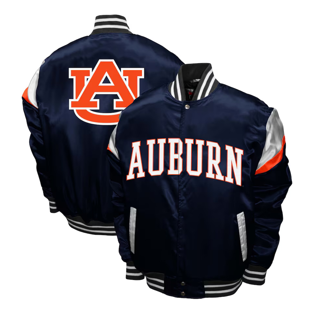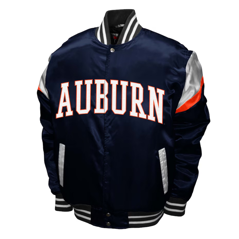 The Auburn Tigers power jacket is a fashionable piece of clothing that combines sports features and high quality. In contrast to the previous designs, this jacket is unisex and made with a satin navy material to give it a facelift. The inner viscose lining makes it comfortable to wear and warm for the purpose of the game or casual occasions.