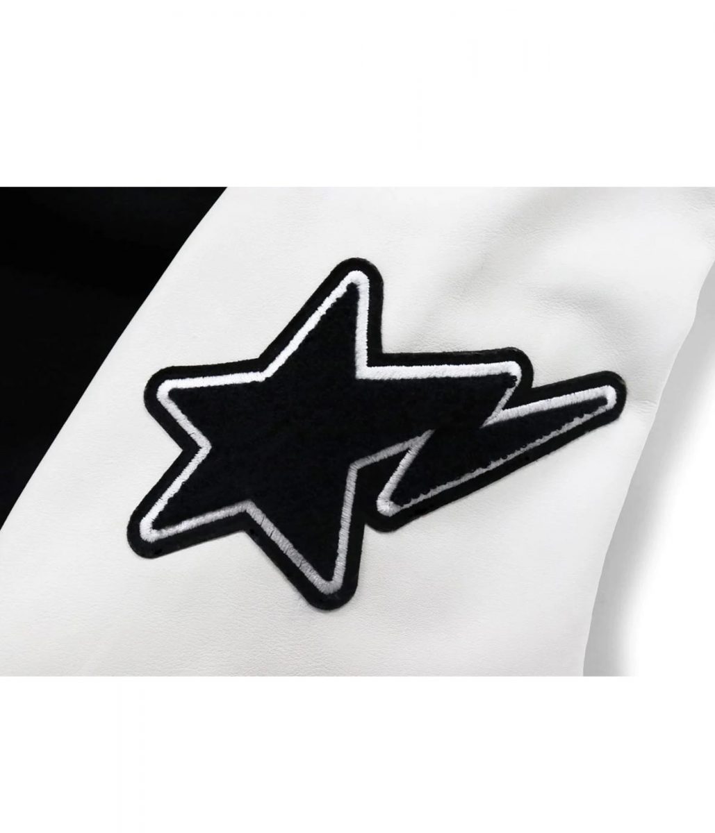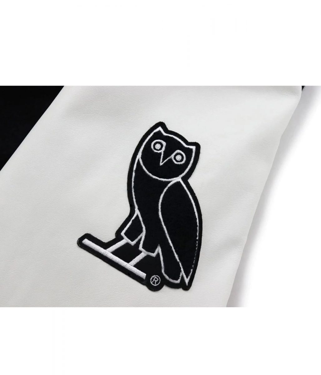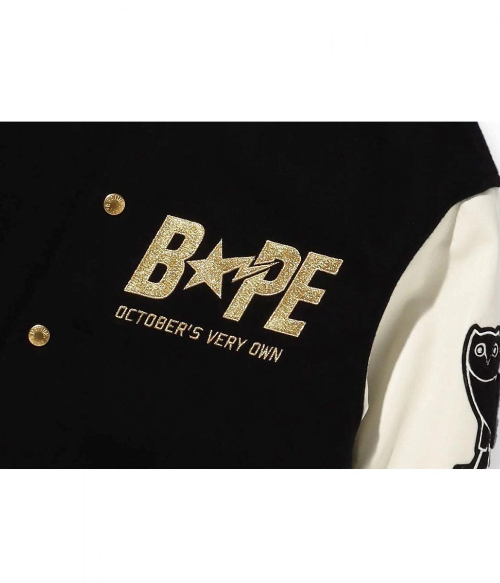 BBape A Bathing Ape OVO Varsity Jacket is a masterpiece for true streetwear lovers. Inspired by the collaboration between A Bathing Ape and October’s Very Own, this varsity jacket blends Japanese urban culture with North American street fashion. The striking black and white color scheme reflects bold individuality while keeping a timeless appeal.