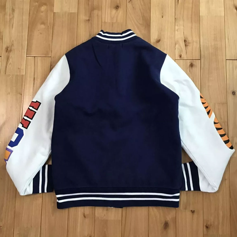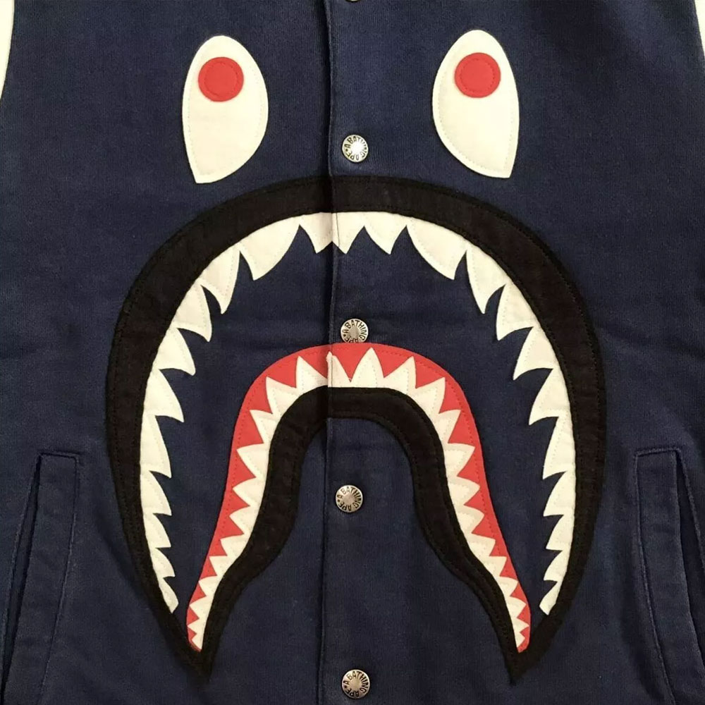 The Bape Shark Sweat Jacket features a rib-knit collar, cuffs, and hemline for a snug and sporty fit. Its full-snap button closure completes the authentic varsity look, while long sleeves detailed with patches and distinctive lettering enhance its individuality. At the chest, the signature Bape Shark logo adds an unmistakable edge, representing fearlessness and originality within modern street fashion.