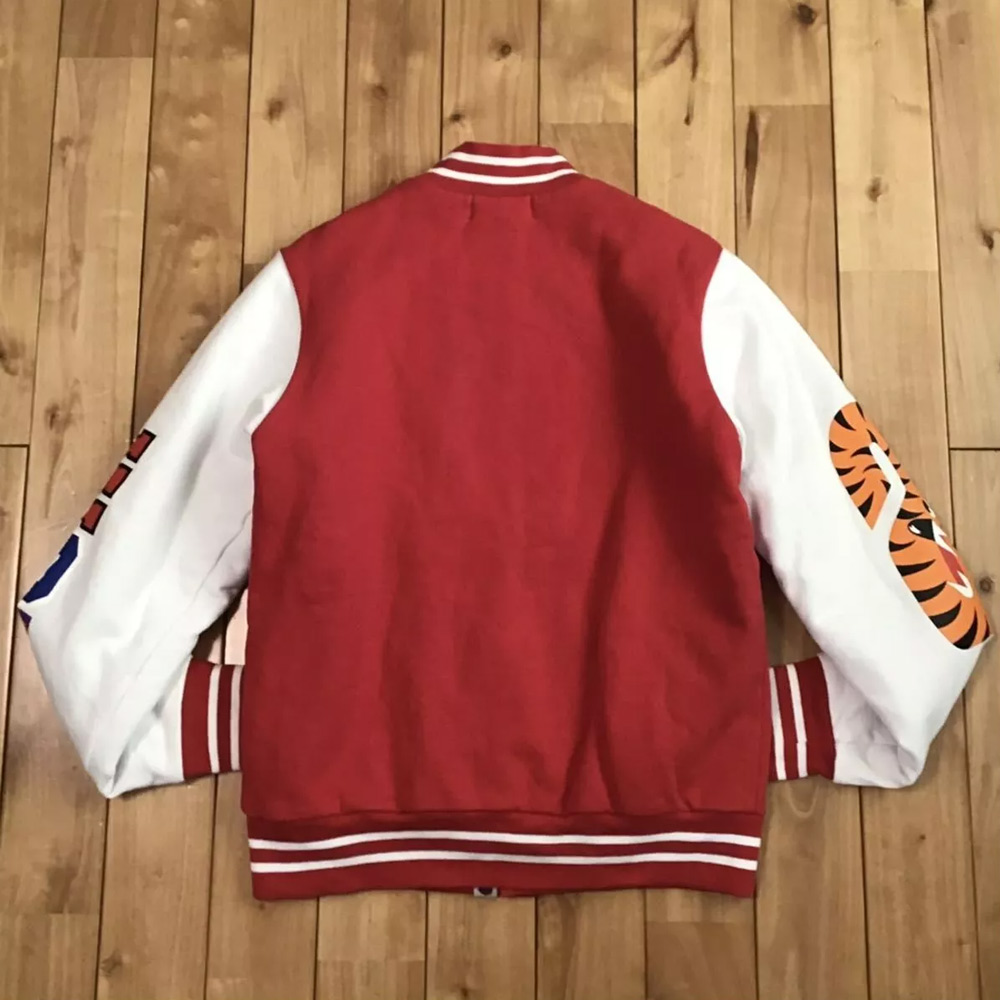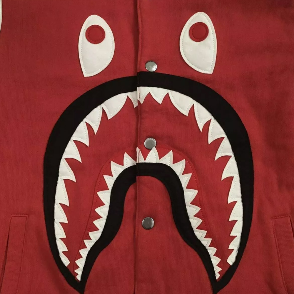 Bring bold streetwear energy into your wardrobe with the Bape Shark Sweat Jacket, an exclusive piece that blends varsity tradition with urban attitude. This red and white varsity jacket is designed for both men and women who want to make a fearless fashion statement. Crafted with a premium wool body and genuine leather sleeves, it strikes the perfect balance between warmth, durability, and standout style (learn more about A Bathing Ape here).