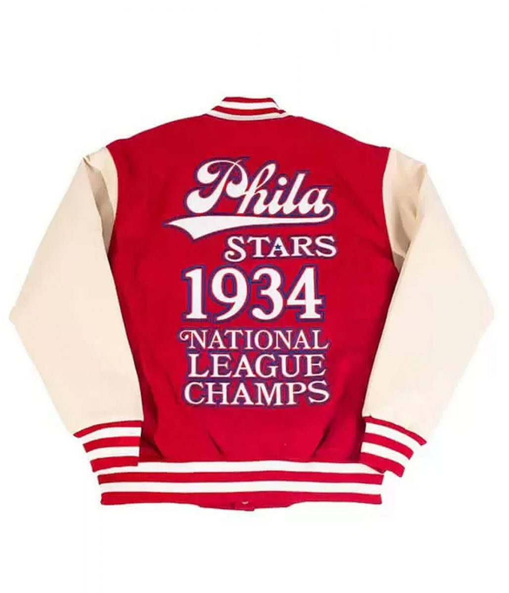 The Philadelphia Stars 1934 varsity jacket Body made from wool and sleeves made from genuine leather. The jacket is available in a glorious red and cream contrast giving it a charming and striking look. The collar of the jacket is rib-knitted style. It has a classic snap tab buttoned front closure with rib knitted hemline. A soft viscose inner lining of the jacket helps you to feel warm and cozy. The sleeves of the 1934 Philadelphia Stars baseball varsity jacket are long fitted with rib-knitted cuffs. The jacket has two side waist pockets for saving money and valuable products. The fine quality stitching of the Philadelphia Stars 1934 varsity jacket makes it comfortable and desirable to wear. The jacket is an ideal choice for sport lovers.
