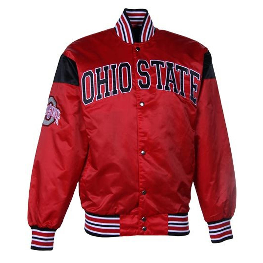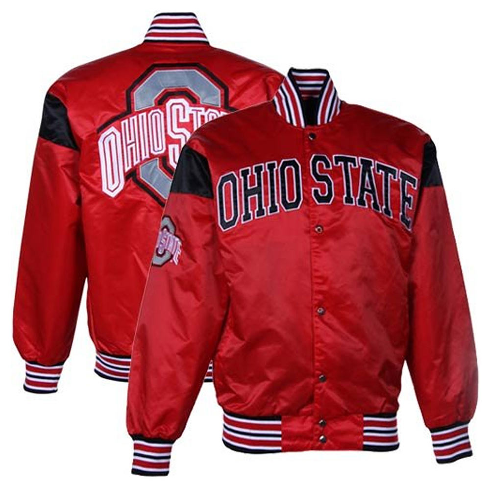 The Big League Ohio State Buckeyes Jacket, meticulously tailored from luxurious satin. Adorned in a captivating red hue, this jacket stands out with its vibrant charm. The Ohio State Buckeyes Big League Jacket showcases a rib-knitted collar and a front buttoned closure, effortlessly blending style and convenience. Adorned with logos on the front, sleeves, and back, it exudes a distinctive presence. Wrapped in a soft viscose lining, the inner cocoon assures comfort with every wear. The elongated, form-fitting sleeves, coupled with rib-knitted cuffs, ensure a sleek silhouette. For functionality and allure, two side waist pockets elegantly integrate utility. Impeccable stitching guarantees the jacket’s enduring quality. A favored choice among stylish individuals, the Big League Ohio State Buckeyes Jacket perfectly embodies contemporary sophistication for both men and women, making it ideal for casual occasions.