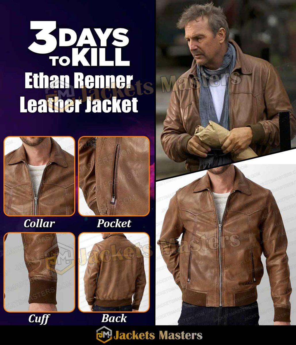 The Ethan Renner leather jacket is made from high-quality genuine leather. The jacket is available in a majestic brown color, which gives it an innovative and enchanted look. The collar of the jacket is rib-knitted style. It has a branded YKK front zipper closure. A soft viscose inner lining of the jacket keeps you calm and relaxed. The sleeves of the Kevin Costner 3 Days to Kill leather jacket are full-length ends with ribbed cuffs. The jacket has two outside pockets and two inside pockets for keeping stuff. The fine quality stitching of the Ethan Renner leather jacket makes it durable and desirable to wear. The jacket is an ideal choice for parties.