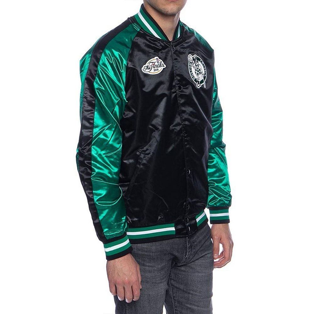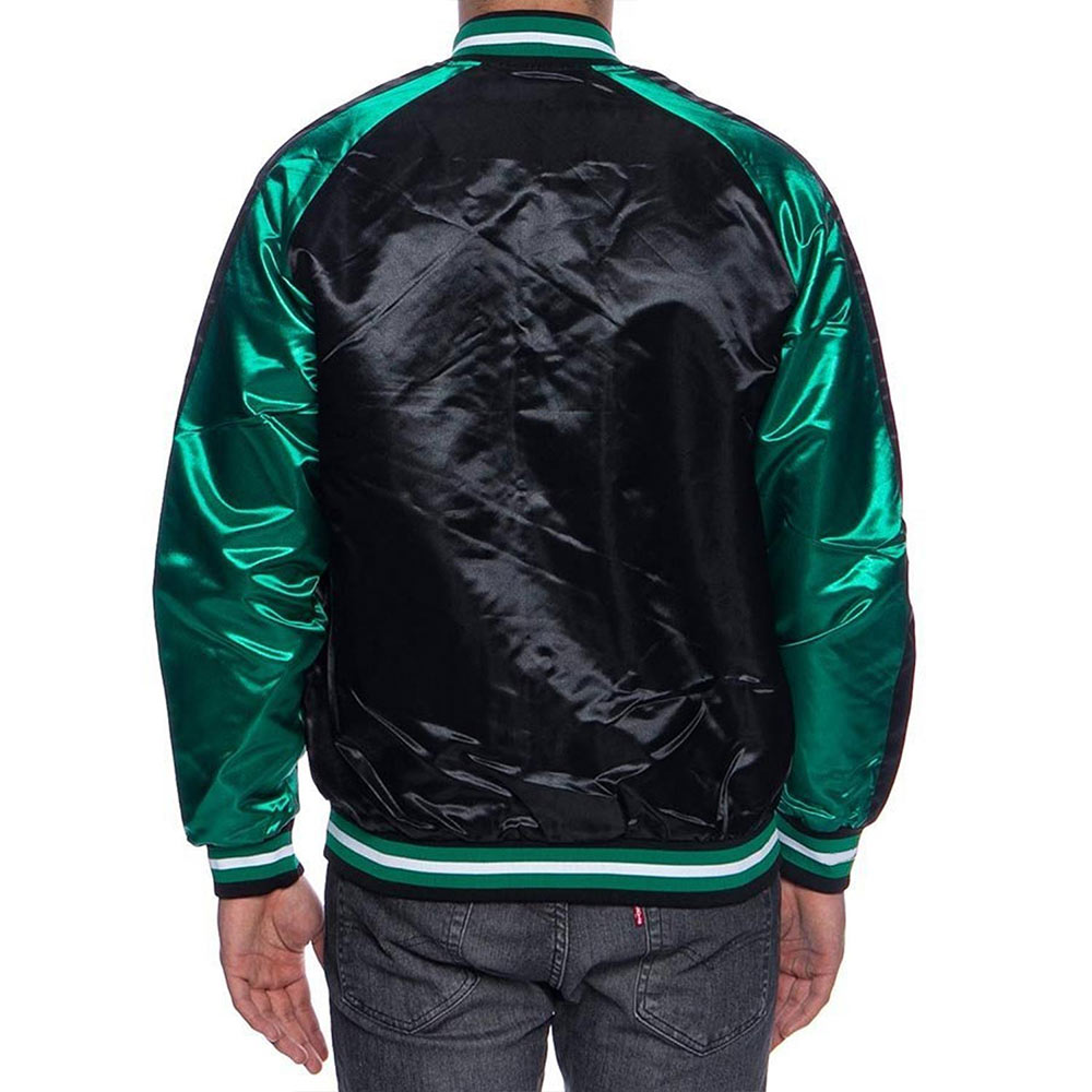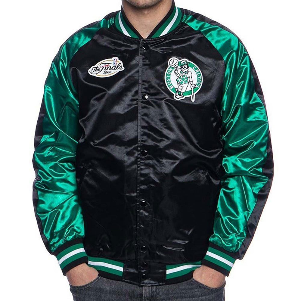 The Boston Celtics Black and Green Satin jacket is made up of high-quality satin. The jacket is available in a mesmerizing black and green color combination, which gives it an innovative and striking look. The jacket has shirt style collar. The jacket has branded YKK zipper front closure. A soft inner viscose lining of the jacket keeps you warm and relaxed. The sleeves of Finals 2008 Boston Celtics Black and Green jacket are long with rib knitted cuffs. The jacket has two inner and two side pockets. The fine quality stitching of Boston Celtics Black and Green Satin jacket is comfortable and desirable to wear. The jacket is an ideal choice to wear in parties.