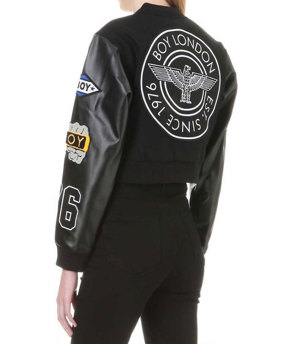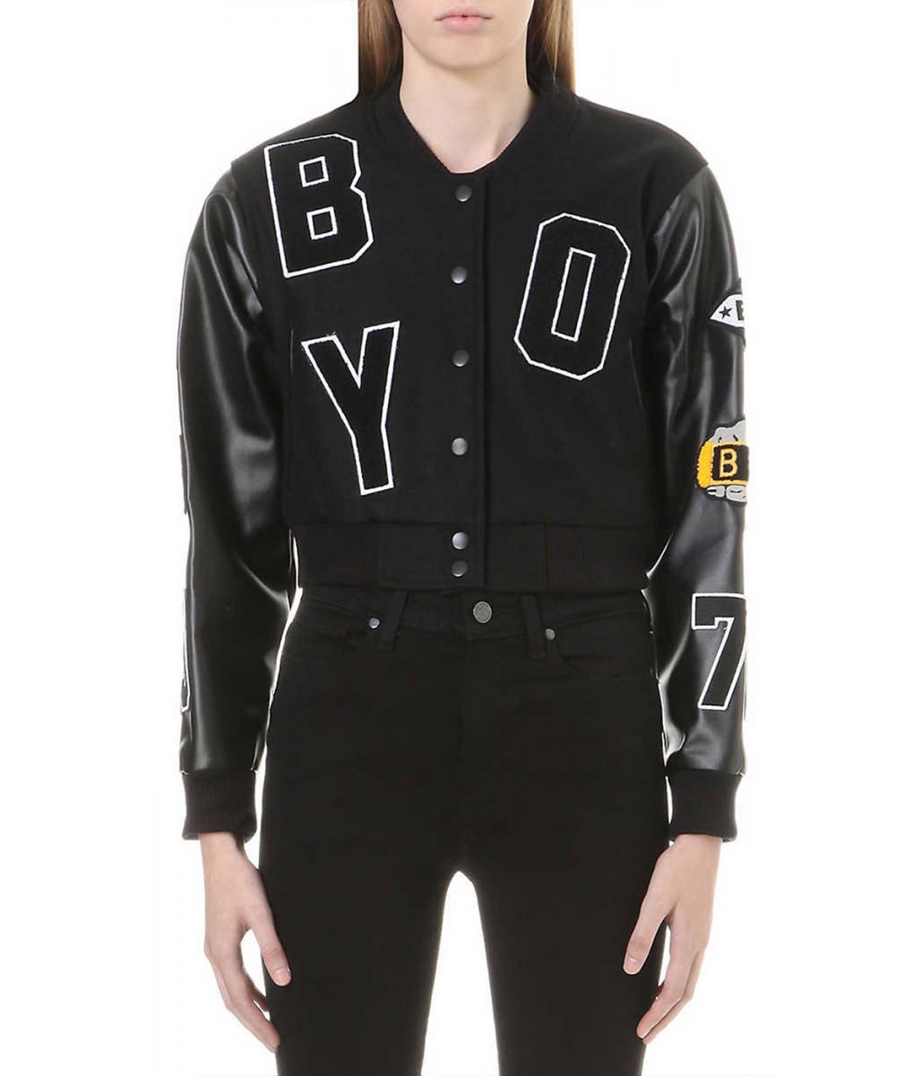 The Boy London Crop Varsity jacket body made from wool and sleeves made from genuine leather. The jacket is available in a mesmerizing black color, which gives it an innovative and dazzling look. The collar of the jacket is a rib-knitted style. It has snap tab buttoned front closure. A soft viscose inner lining of the jacket keeps you warm and relaxed. The sleeves of the Black Cropped Varsity jacket are full-length ends with rib-knitted cuffs. There is patch of duck on front side of jacket. The jacket has two side waist pockets for keeping stuff. The fine quality stitching of the Boy London Crop Varsity jacket makes it durable and comfortable to wear. The jacket is an ideal choice for casual wearing.