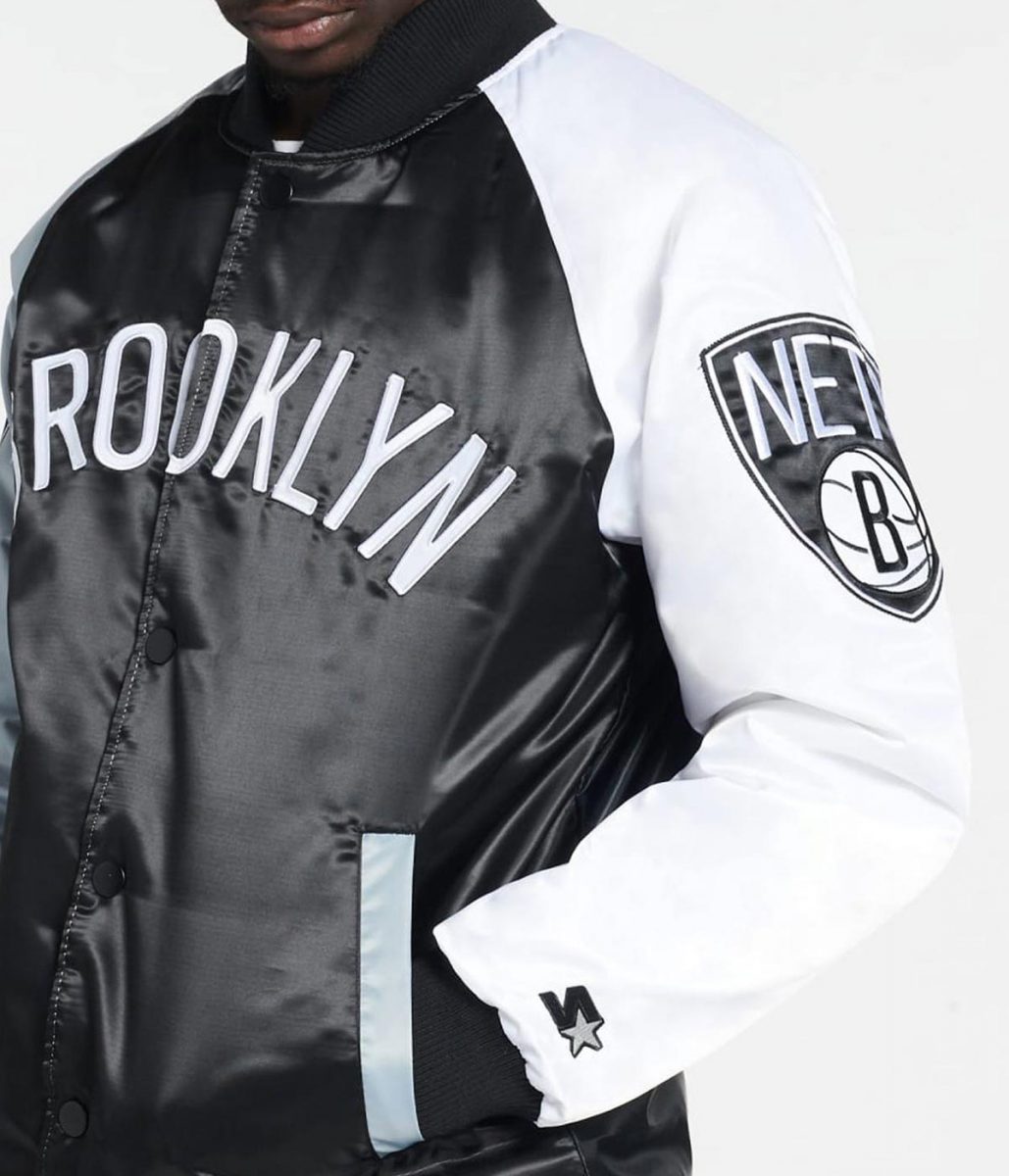 The Brooklyn nets logo black and white varsity jacket is made from satin. The jacket is available in a classic black and white color combination that makes it stand out. The Brooklyn nets remix satin jacket has a rib knitted collar and a buttoned closure. The sleeves of the jacket are long and fitting with rib knitted cuffs. To keep stuff the Brooklyn nets logo black and white varsity jacket has two side waist pockets. The jacket has the team logo on the chest and the Brooklyn patch at the back. The hemline of the Brooklyn logo black and white varsity jacket is rib knitted that makes it stand out. The inner of the jacket consists of a soft viscose lining for warmth and comfort. The fine quality stitching makes the jacket durable to wear. The jacket is perfect for a game night.