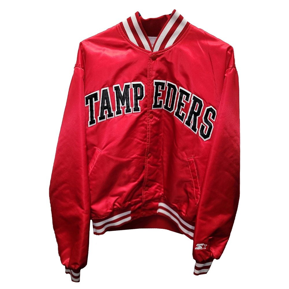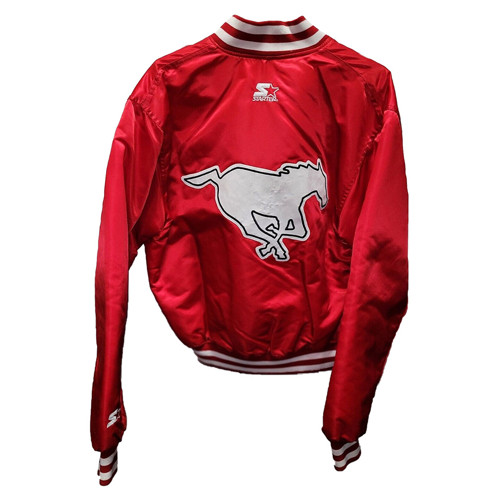 The 90s Calgary Stampeders jacket is available for both male and female fans. As for this beautiful prototypical piece, one can witness its relation to the team of Calgary Stampeders and the flair of the seventies. Made from satin and has a viscose lining inside that ensures it is very comfortable to wear. It is vivid red in color and also features ribbed collar, cuffs and at the hemline which gives it a typical varsity look. The 90s Calgary Stampeders jacket has the full and fitted sleeves with buttoned front fastening. It features emblem on the back and the name of your team-Stampeders on the chest so that there will be no mistaking which side you are on. Fashioned ergonomically, it has two sloping pockets on the waistline and a concealed pocket for your valuables.
