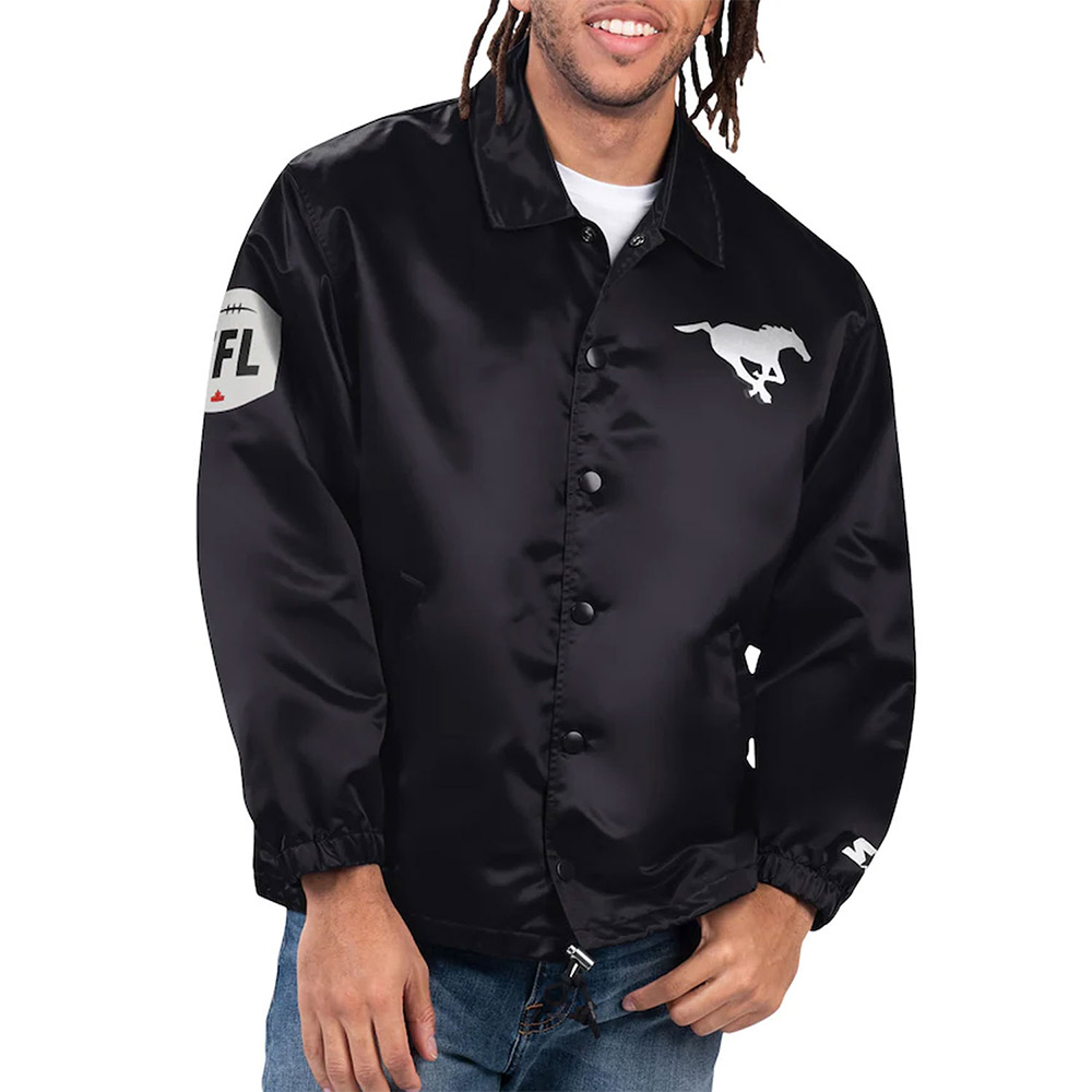 Intensify your game-day outfit with the Calgary Stampeders Coaches Jacket which is intended for male and female sports enthusiasts. This elegant and stylish jacket takes its design from the Calgary legend Stampeders Football Team. Made from satin fabric of superior quality, it has viscose lining for easy wearing. Black hue brings elegance, the ribbing at the collar, cuffs, and the hemline contributes to the traditional feel of the piece. The full-length fitted sleeves accompanied with an authentic NFL patch for fully expressing your football spirit. The coordinating front buttoned closure of Calgary Stampeders option route black Coaches Jacket further provides a fitted design while on the reverse, the embroidering of a team logo on the front and a wordmark on the back keeps everyone in no doubt of your allegiance. Functionality being the name of the game it has two slanted front pockets and internal pocket for your wallet or phone.