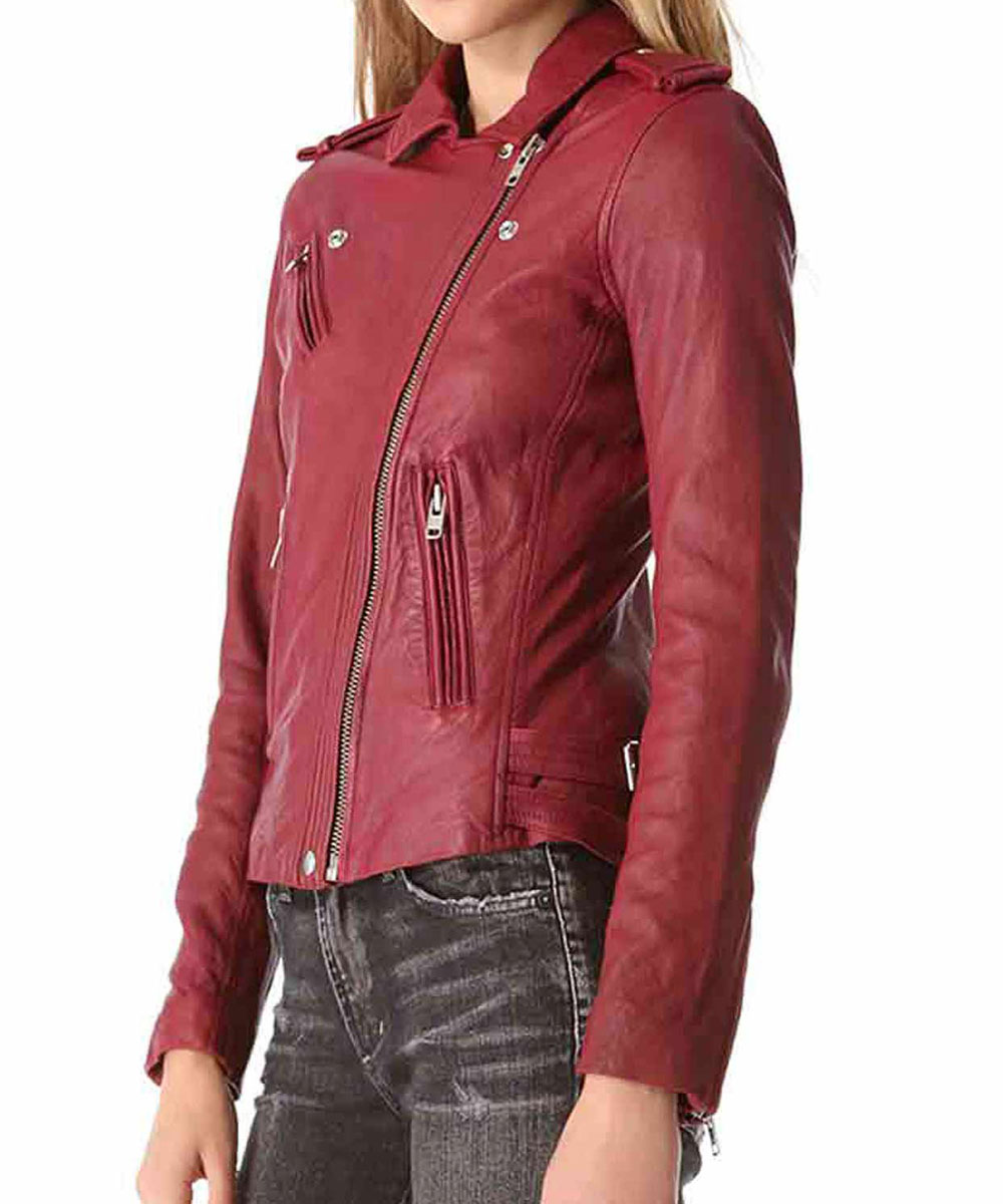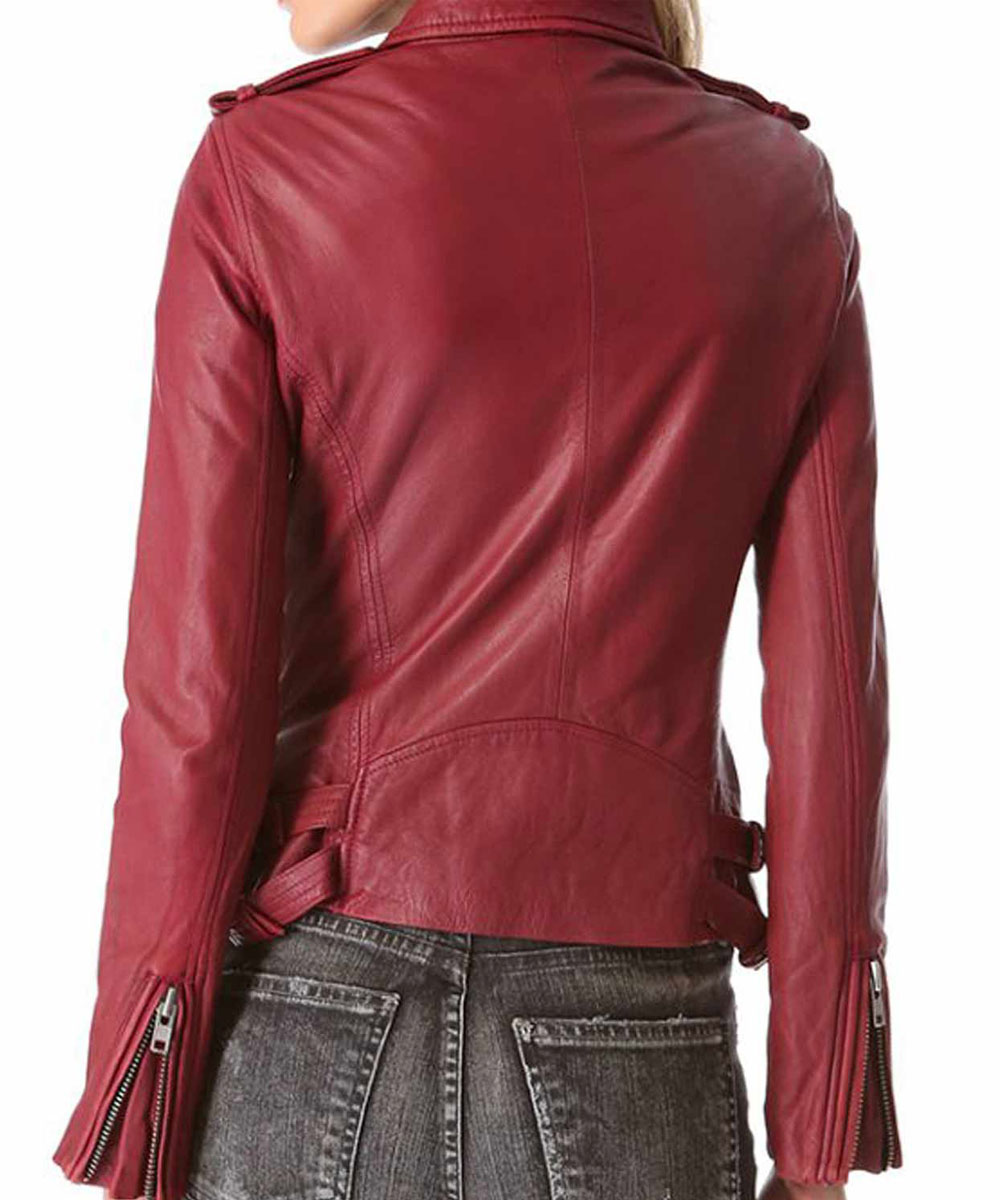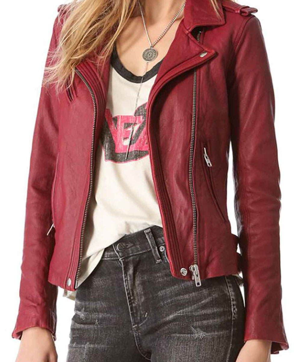 The Kate Beckett Red Leather Jacket is fabricated from high-quality genuine leather and is available in reddish maroon color. The simple shirt-style collar and asymmetrical zipper front closure of the jacket gives it a stylish and smart look. The inside of the Castle Stana Katic Red Leather Jacket has a soft viscose lining which makes it comfortable to wear. The jacket has zipper pockets on side waists and chest to keep things secure. The sleeves of the jacket are full with smart rib-knitted cuffs. The buttoned shoulder straps and buckled straos on hemline of the jacket looks alluring and eye-catching. The Castle Kate Beckett Leather Jacket is finely stitched with lovely stitched lines on front