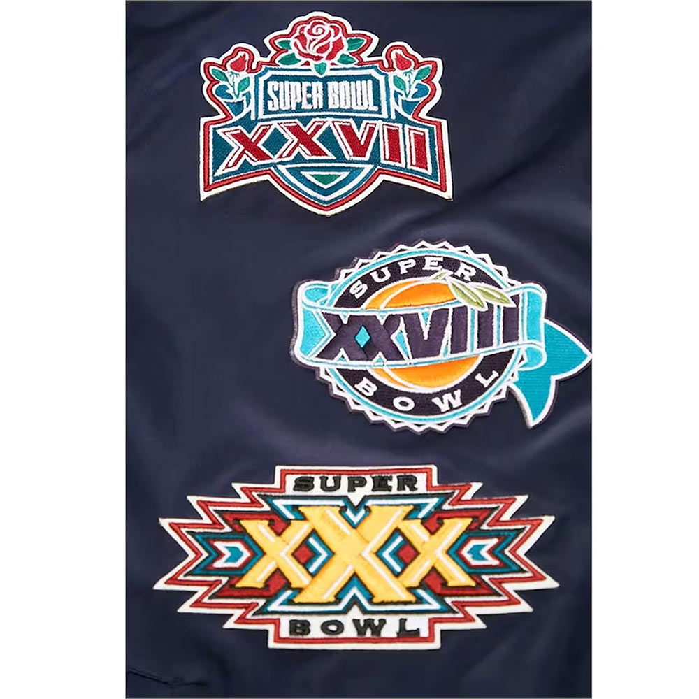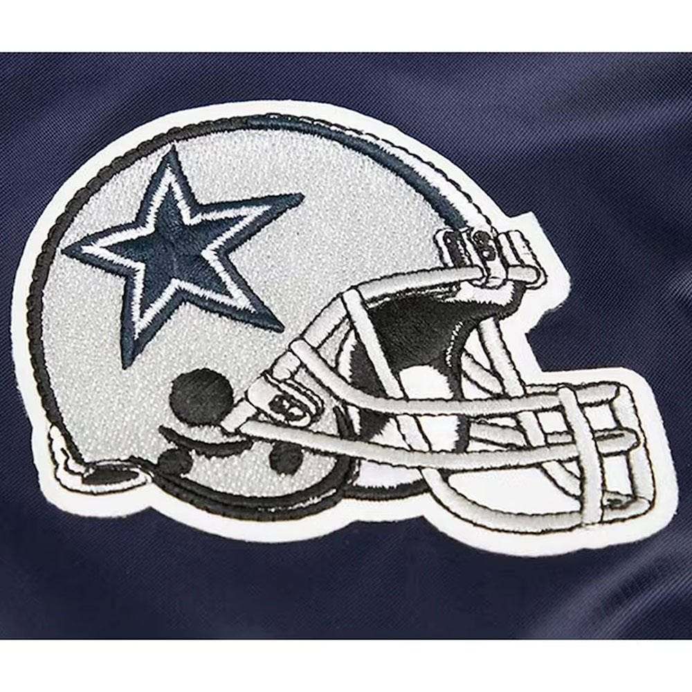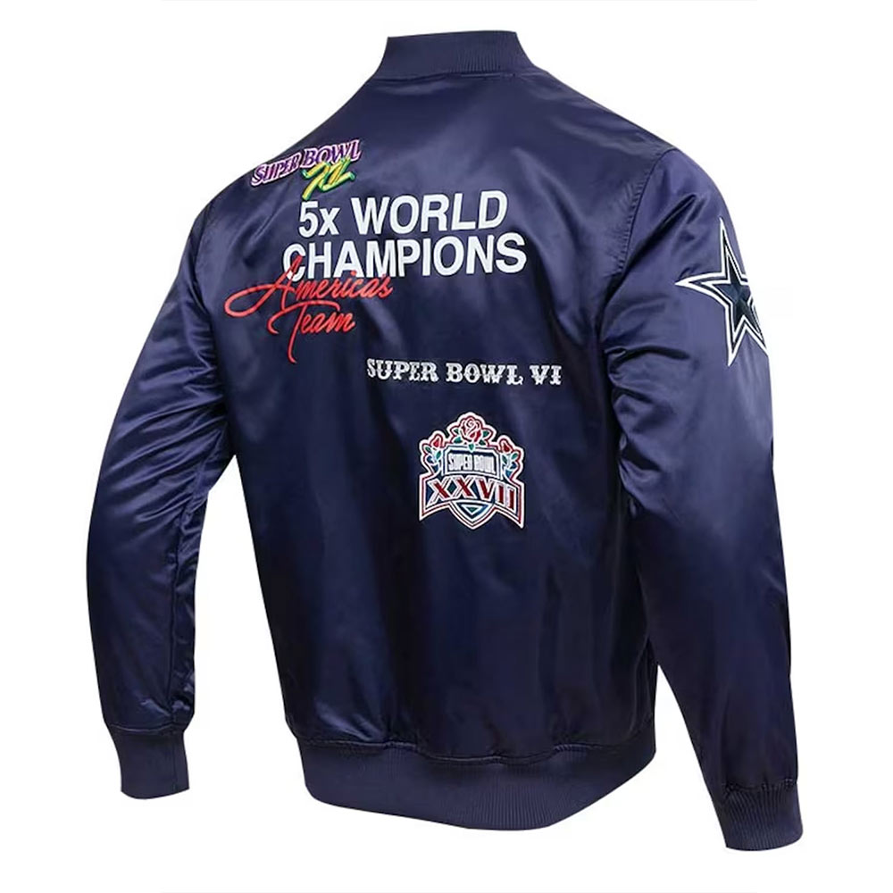 The Dallas Cowboys Championship Navy Satin jacket is made up of high-quality satin. The jacket is available in a glorious navy blue color, which gives it an innovative and attractive look. The jacket has shirt style collar. The jacket has branded YKK zipper front closure. A soft viscous inner lining of the jacket keeps you warm and relaxed. The sleeves of Championship Dallas Cowboys Navy Satin jacket are long with rib knitted cuffs. The fine quality stitching of Dallas Cowboys Championship Navy Satin jacket is comfortable and desirable to wear. The jacket is an ideal choice to wear on sports day.