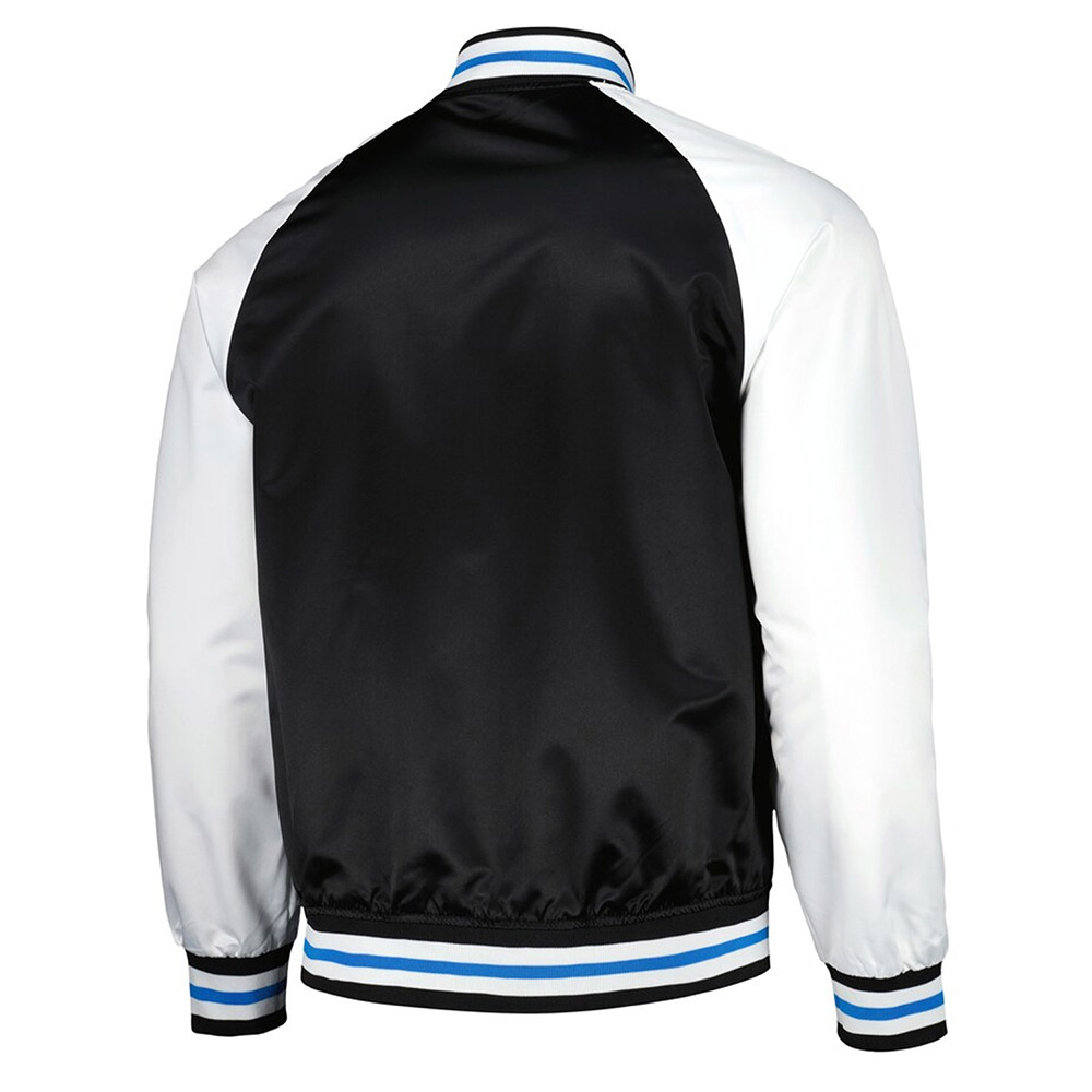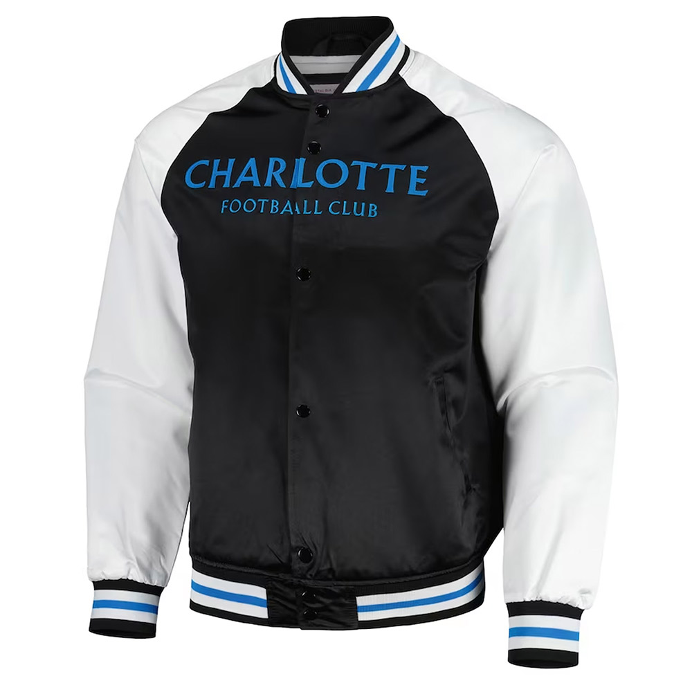 Embrace gridiron fervor with the Charlotte FC black and white jacket, a marvel in high-grade satin. The dramatic interplay of black and white paints a tale of daring sophistication, etching your name in fashion history. The rib-knitted collar gracefully entwines with a snap tab buttoned front closure, setting a new era of modish convenience. Inside, a plush viscose lining offers warmth and repose, where comfort meets luxury. The long sleeves, adorned with rib-knitted cuffs, play a symphony of refinement. With four pockets, practicality aligns with modern-day trends. Witness impeccable stitching in this Charlotte FC black and white satin jacket.