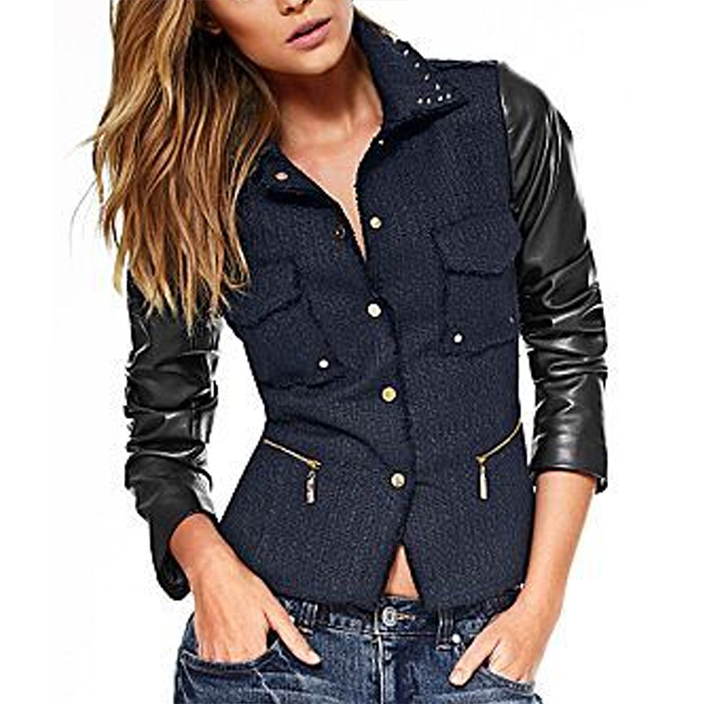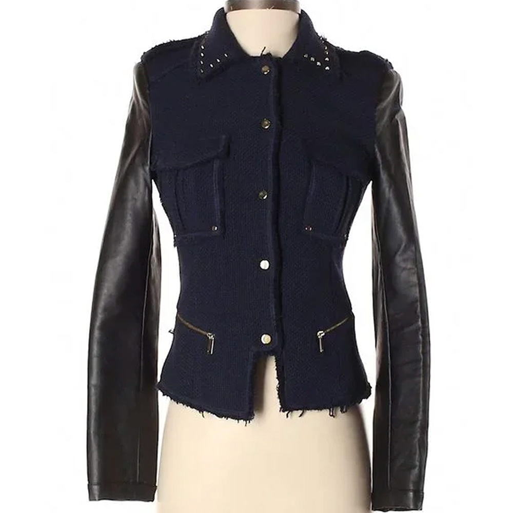 Stand out with the April Carver Navy and Black Jacket, as worn by Italia Ricci in Chasing Life Season 1. This exceptional jacket is a blend of classic elegance and contemporary style, designed to make you stand out. The body is made from fine wool in a rich navy blue, while the sleeves are crafted from genuine black leather, creating a unique and striking contrast. It features a classic shirt-style collar and a buttoned front closure, exuding timeless charm with a modern twist. The long sleeves with open hem cuffs and fine quality stitching showcase the craftsmanship behind this piece. With two side pockets and one inner pocket, it offers both style and practicality. The soft viscose lining ensures comfort all day long, the April Carver Navy and Black Jacket perfect addition to your collection.