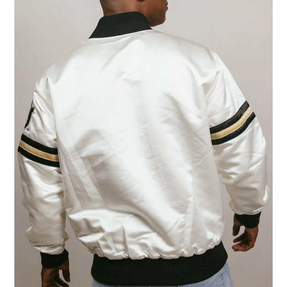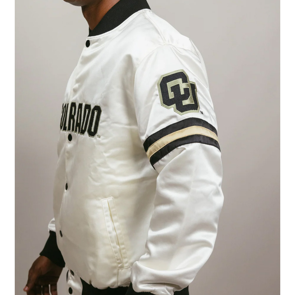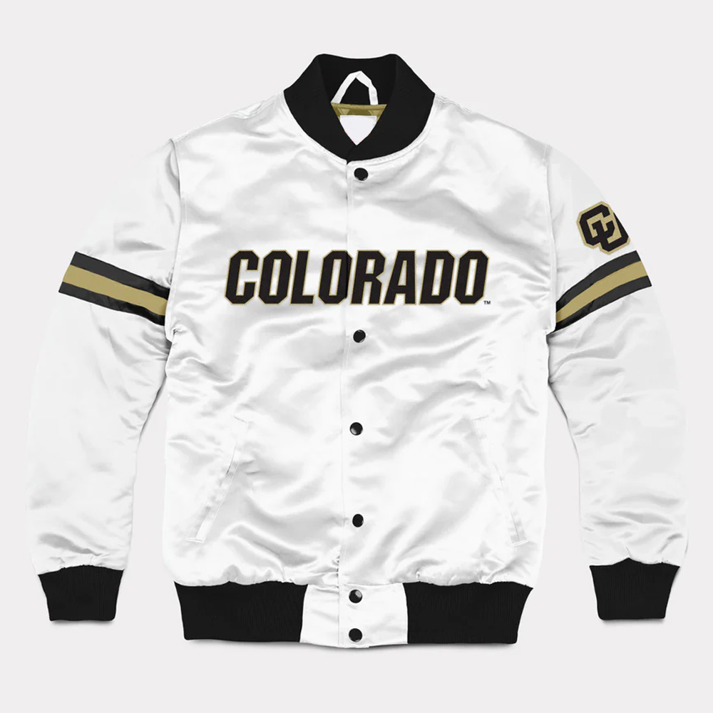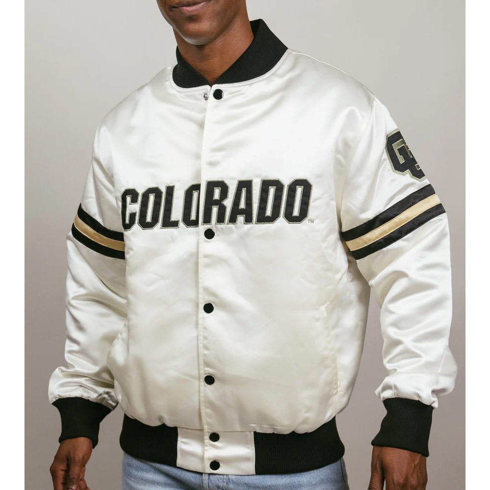 Introducing the Striped Colorado Buffaloes Jacket, it is a versatile and stylish piece that will definitely add to the unveiled passion for your favorite team. This jacket is unisex, thus, it’s suitable for both men and women; it comes with sporty details and austere cut. Made out of smooth satin and accompanied by the comfortable viscose lining, this jacket will create an incredible glossy shine and comfort for the wearer. The rib-knitted collar and the cuffs, and the hemline give it the traditional varsity feel and the right fit. The Colorado Buffaloes Striped white bomber Jacket also has snap tab closure at the front in order to facilitate when wearing or putting off the jacket. It has long-length sleeves with ribbed cuffs and the stripes.