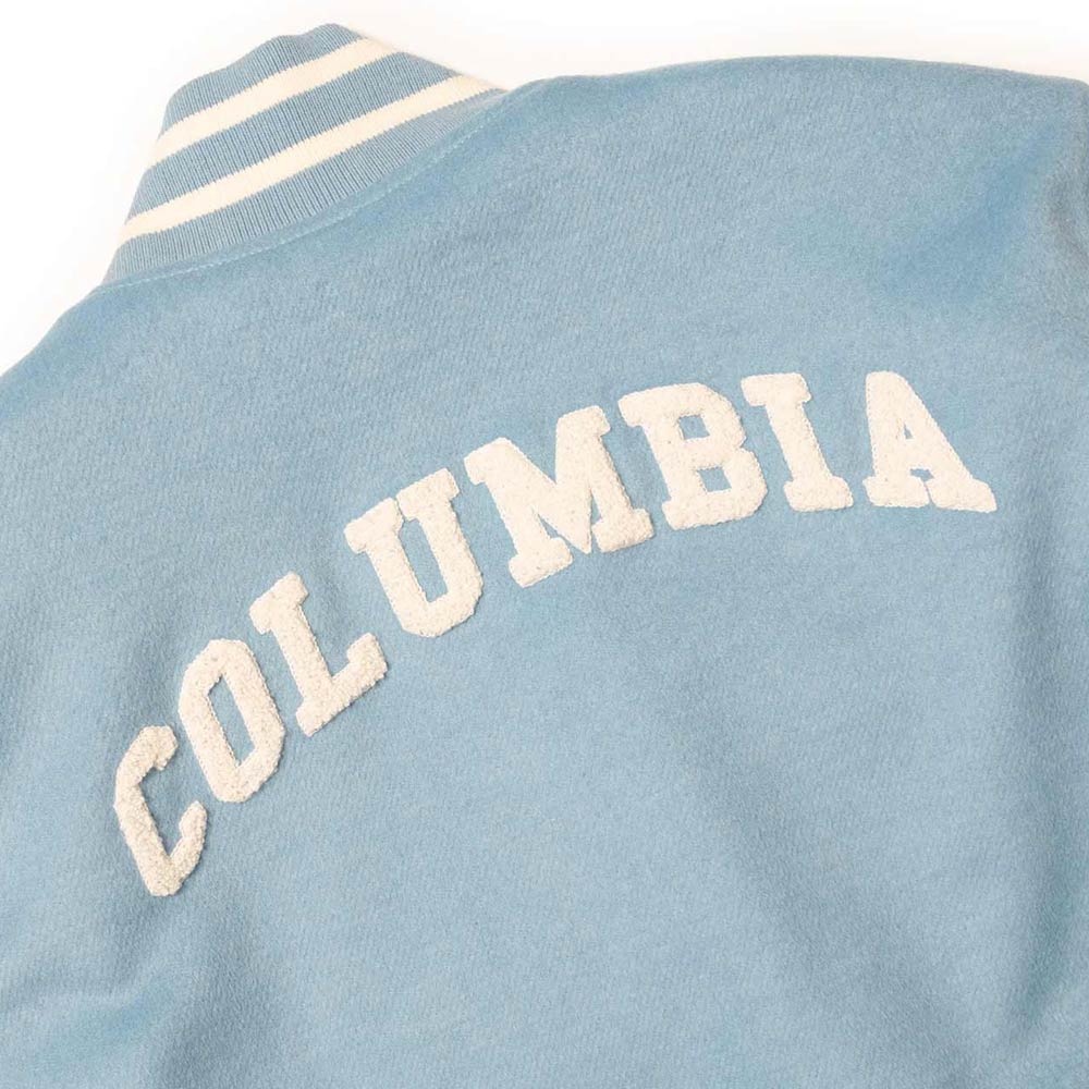The distinctive light blue and white color combination pays homage to Columbia University light blue varsity jacket, while the snap-tab buttoned closure on the front adds a touch of classic elegance. The rib-knitted collar, cuffs, and hemline not only enhance the jacket’s aesthetic appeal but also provide a snug and secure fit.
