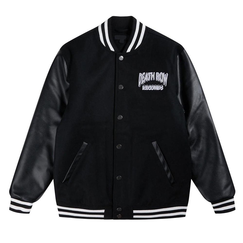 Introducing the Death Row Records Chair Logo Varsity Jacket – a bold and iconic tribute to the legendary record label that defined an era in hip-hop. This varsity jacket seamlessly blends streetwear cool with the unmistakable aesthetic of Death Row Records, making it a must-have for fans who want to showcase their love for the music and style that shaped an era. Death Row Records Black Varsity Jacket has rib knitted cuffs and collar. Its body is made by wool that help to keep cold out and warm in. its leather sleeves gives stylish look.