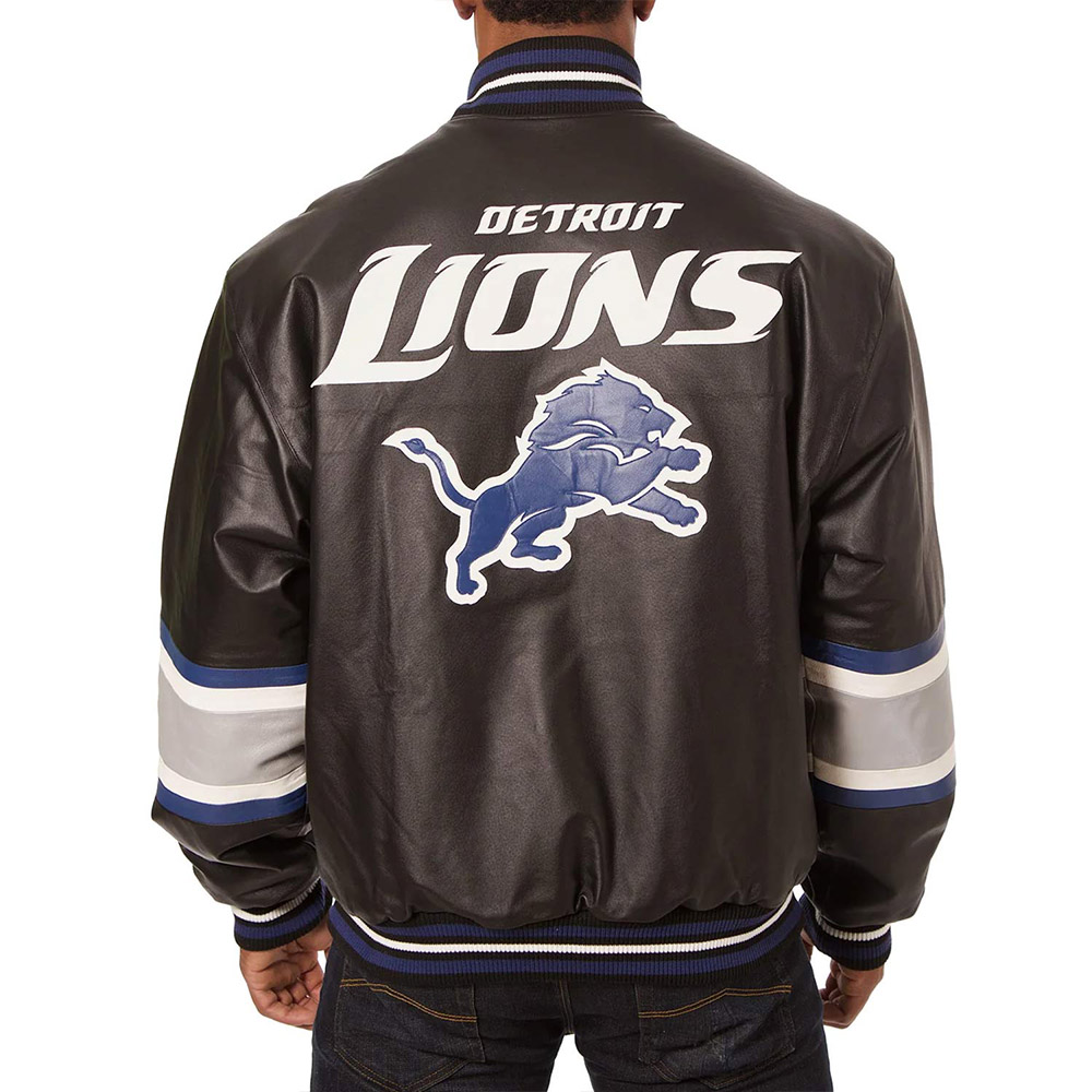 Step into the realm of sporting elegance with our meticulously Detroit Lions Varsity Leather jacket inspired by the legendary Detroit Lions football team. Crafted from premium quality leather, this jacket pays homage to the team’s legacy with its sleek black hue, reminiscent of the iconic jerseys adorning the players on the field. The attention to detail is evident in every aspect, from the rib-knitted collar, cuffs, and hemline that echo the athletic spirit to the fine quality stitching ensuring durability and longevity Immerse yourself in unmatched comfort with the soft viscose lining of Detroit Lions Striped Varsity Black Leather jacket that caresses your skin, providing warmth and luxury throughout the day.