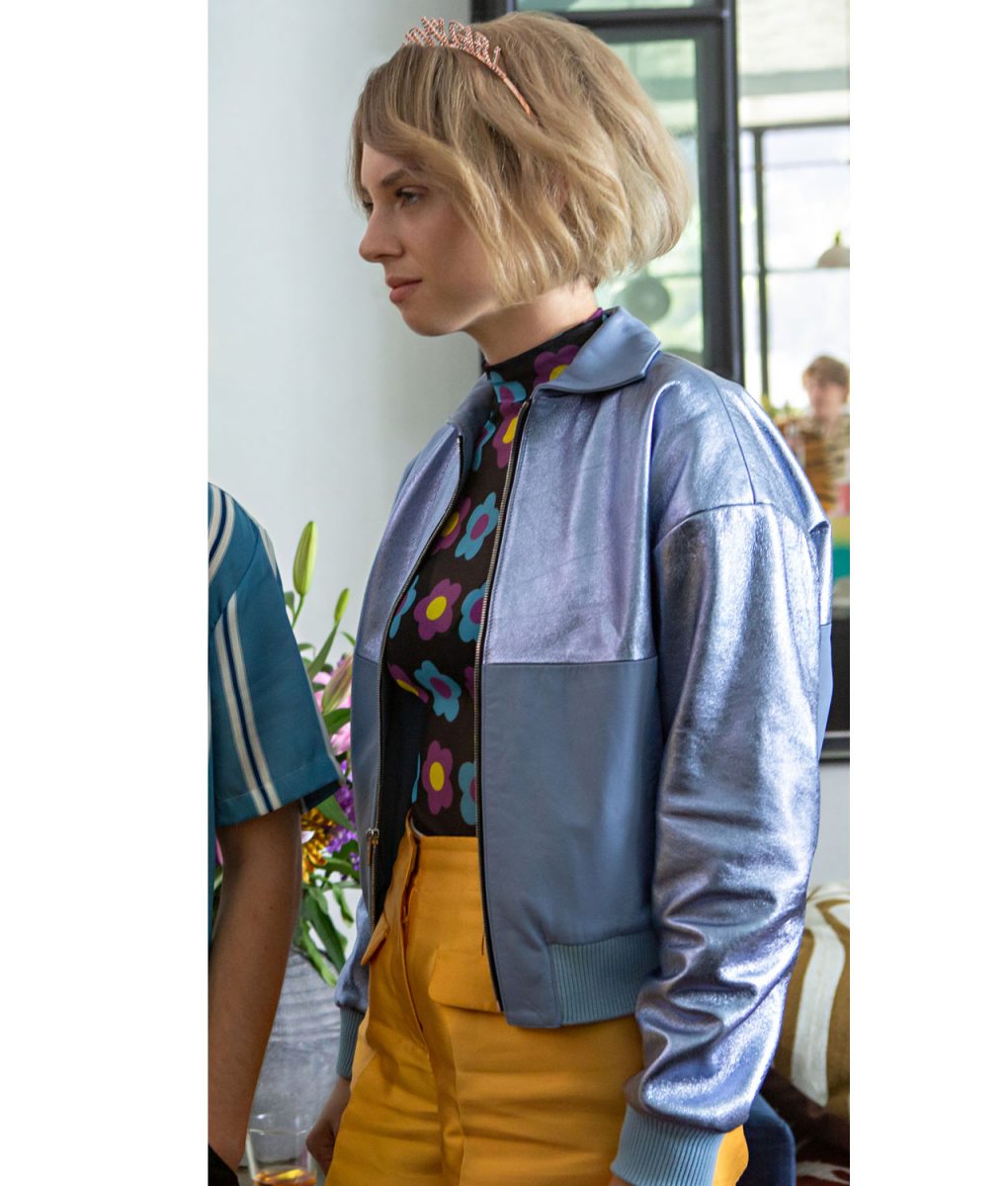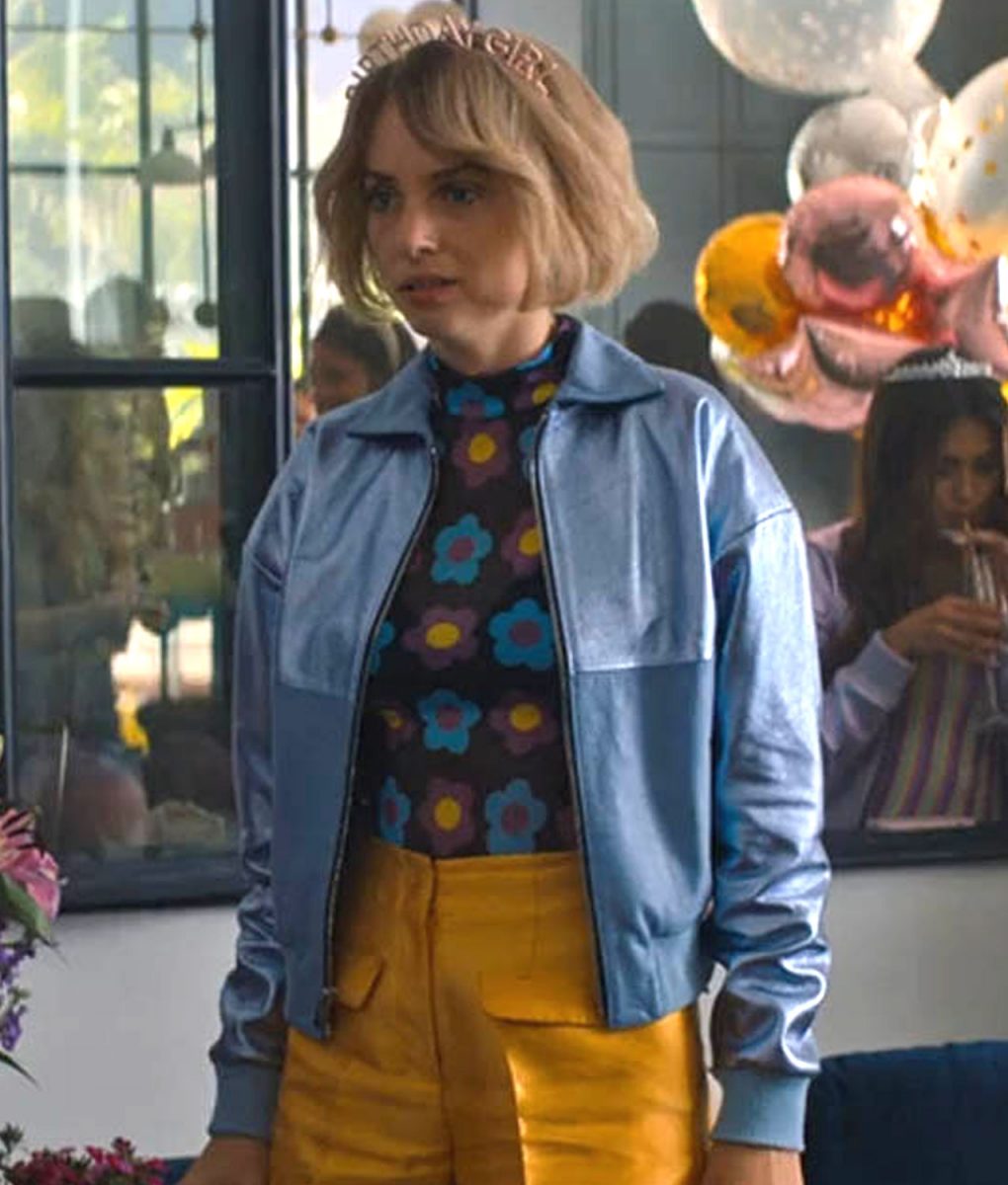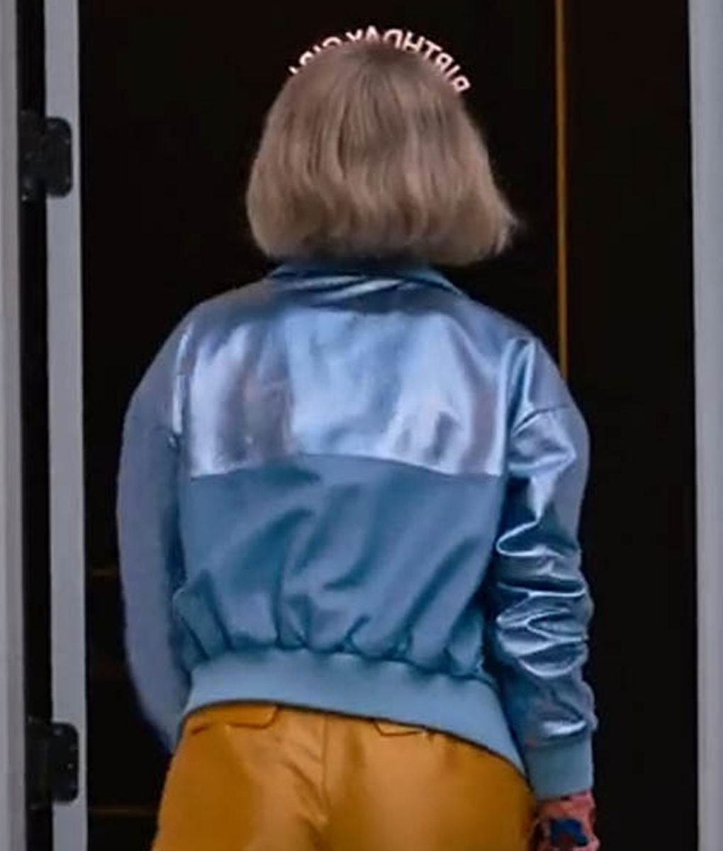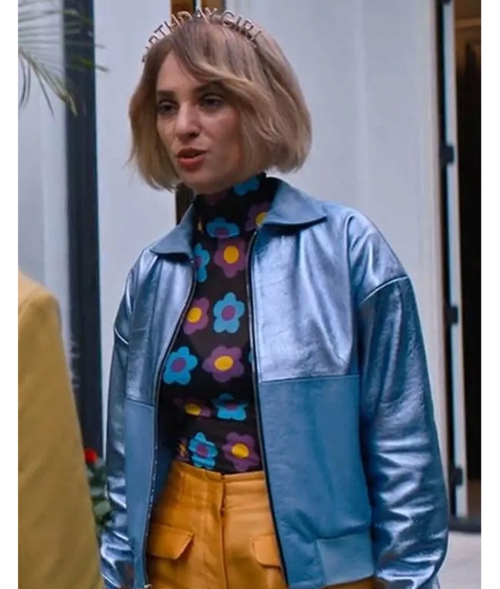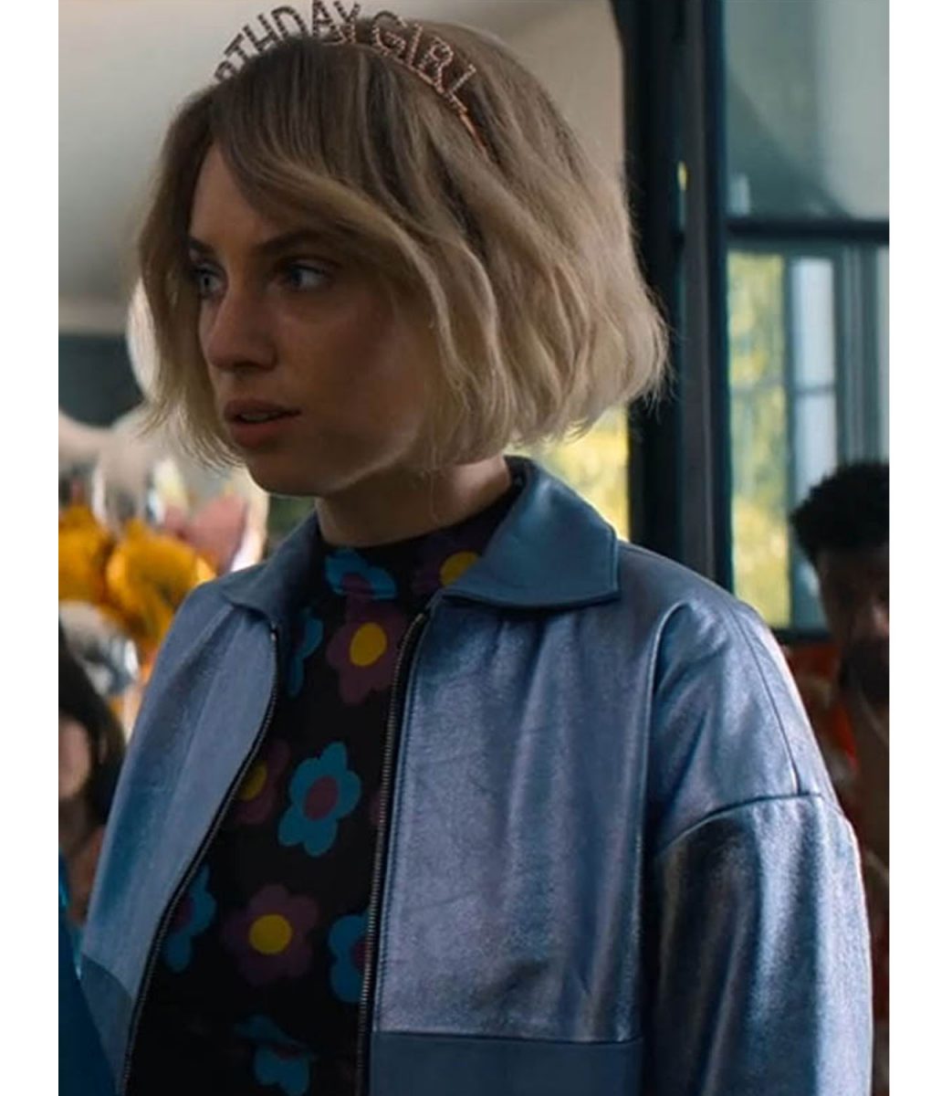 Maya Hawke Do Revenge Eleanor Blue Leather Bomber Jacket