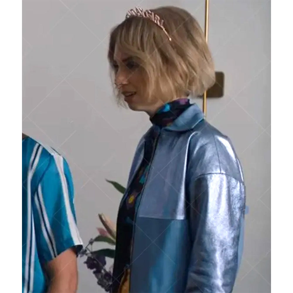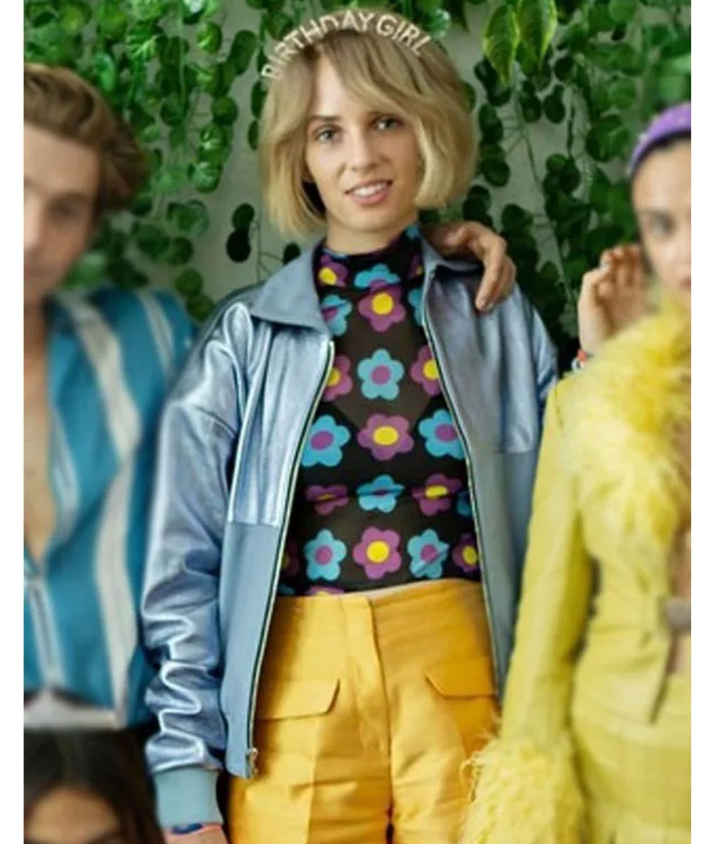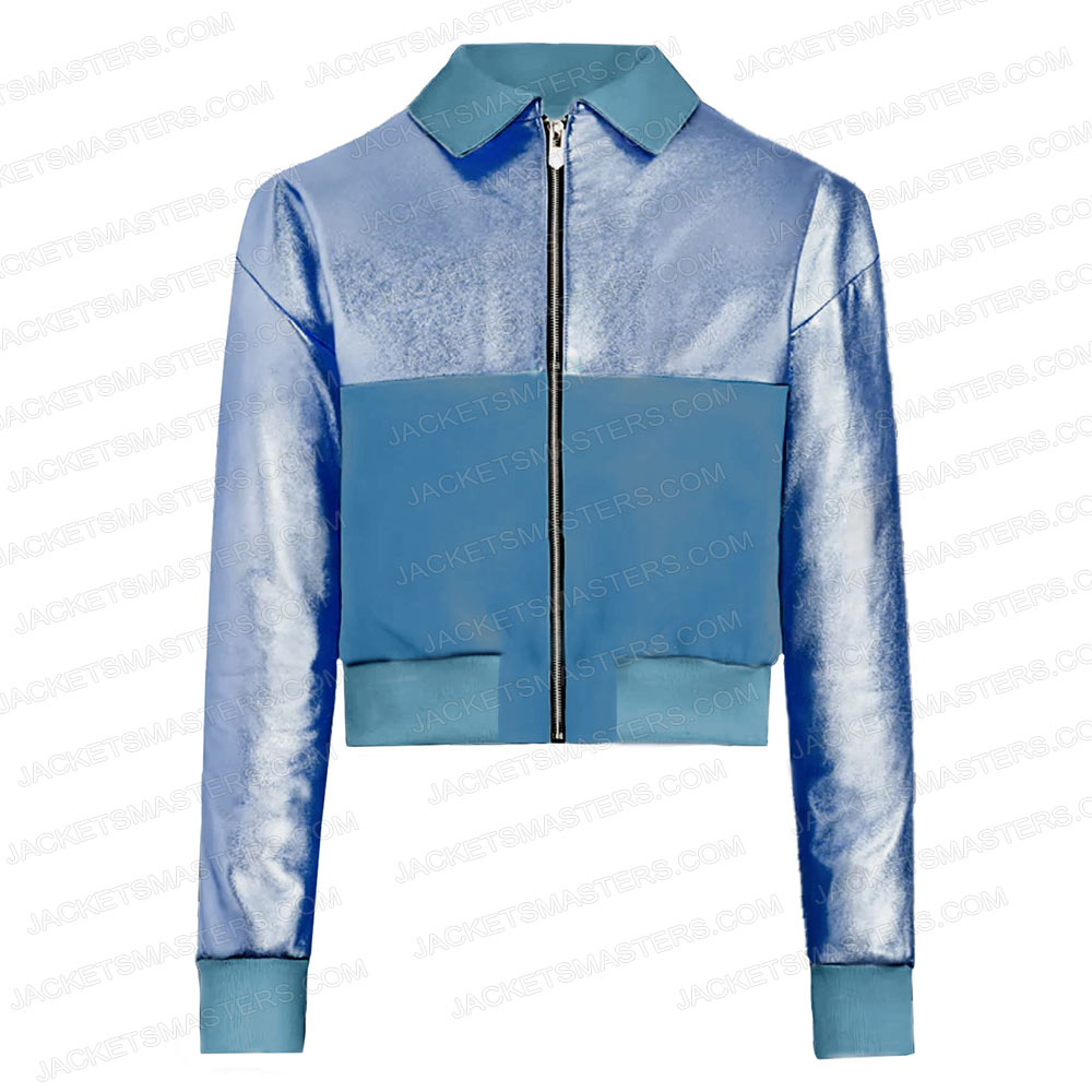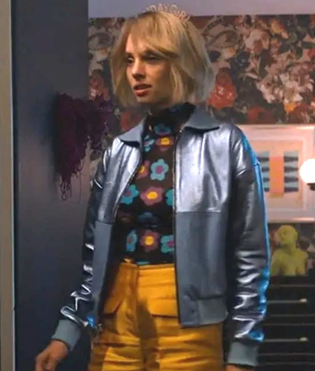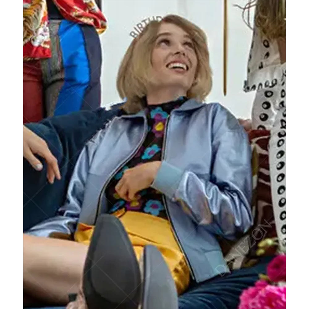Maya Hawke Do Revenge Eleanor Blue Leather Bomber Jacket