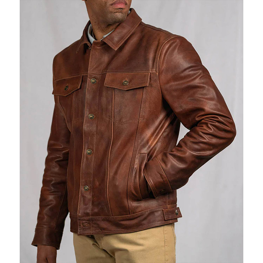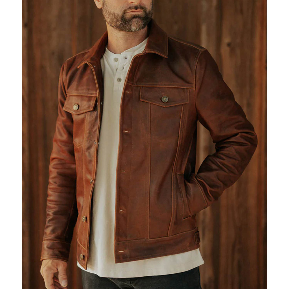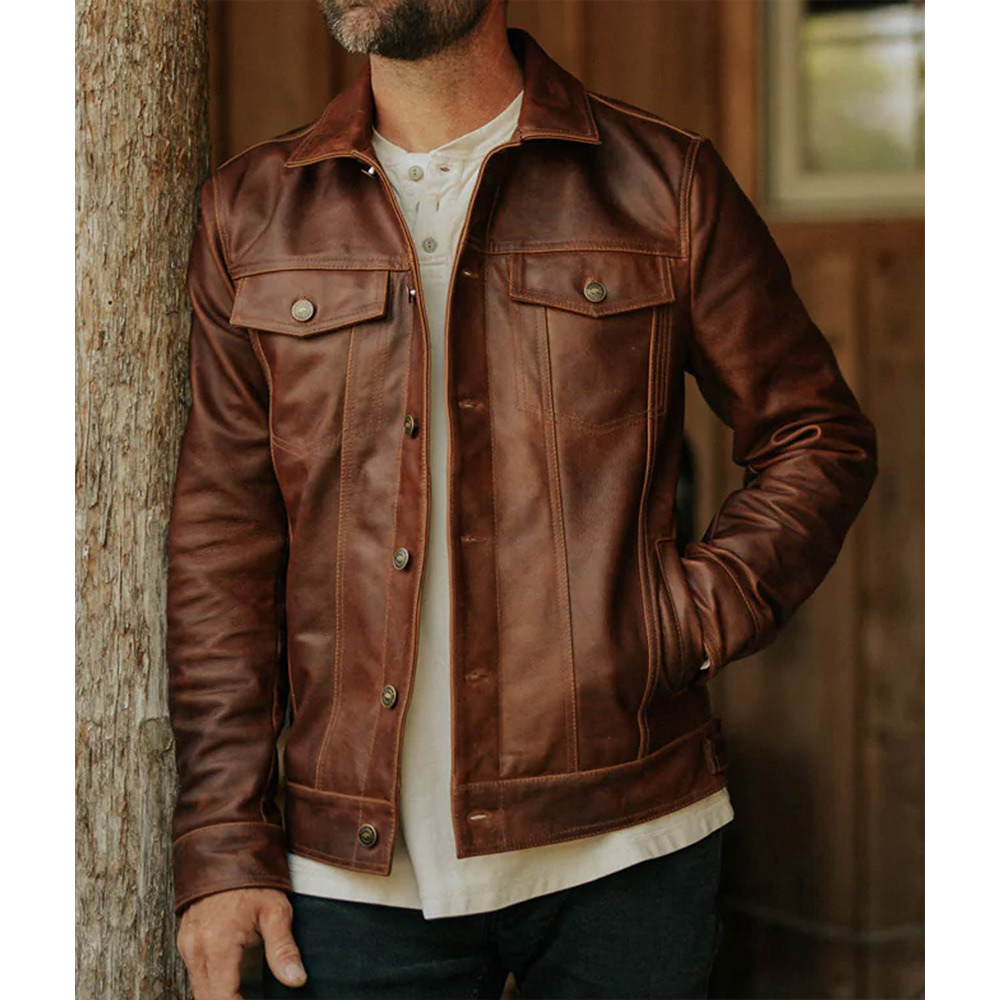 Immerse yourself in a whirlwind of fashion exuberance through the Driggs leather jacket. Meticulously sculpted from opulent genuine leather, it unveils a commanding brown, black and rusty brown color that exudes a sense of individuality. The shirt-style collar and iconic buttoned closure harmonize seamlessly, offering a fusion of style and self-assuredness. Its distinct design stands as a bold proclamation, making it an impeccable choice for dynamic gatherings with companions. The elongated sleeves of the Driggs full-button leather jacket, graced with buttoned cuffs, strike a harmonious balance between comfort and audacity. Swathed in the gentle caress of a viscose inner lining, warmth and serenity accompany your every move. Meanwhile, functional outside pockets and concealed inner compartments cater to your essentials with a touch of flair.