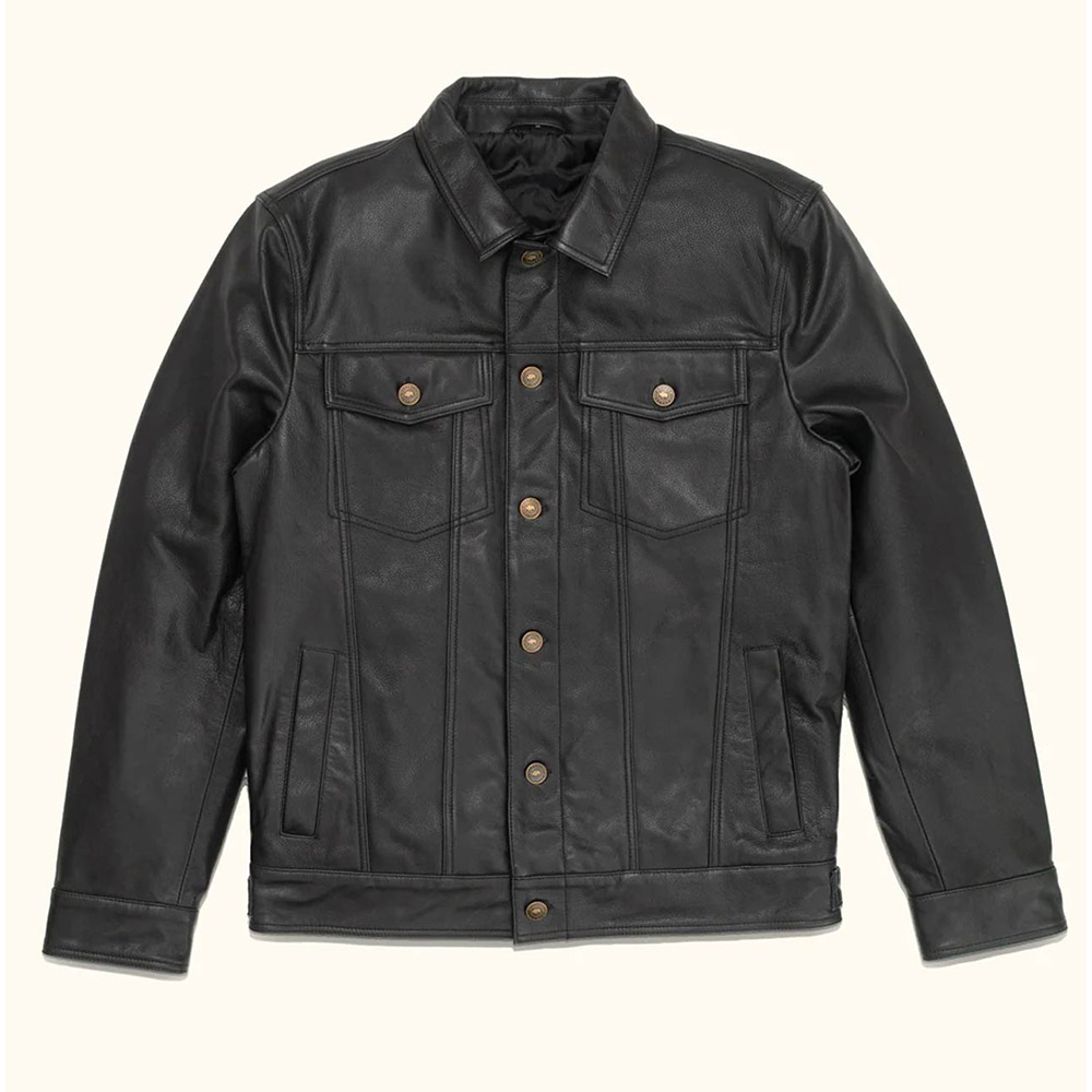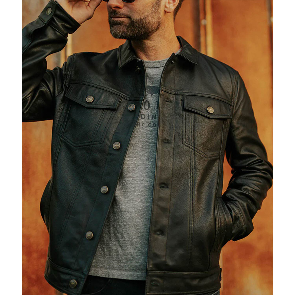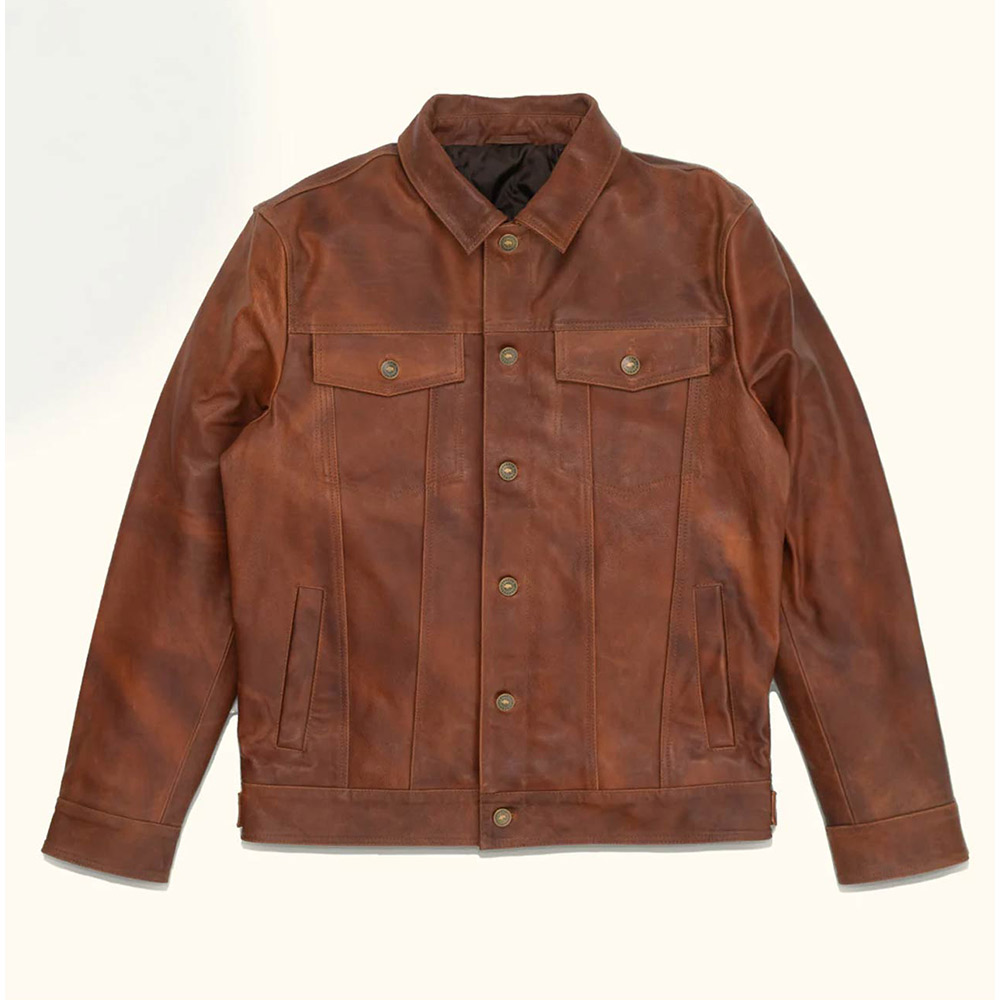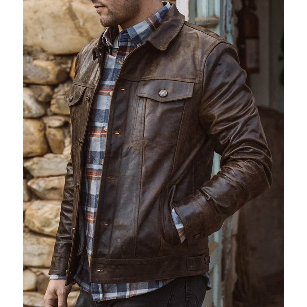 Immerse yourself in a whirlwind of fashion exuberance through the Driggs leather jacket. Meticulously sculpted from opulent genuine leather, it unveils a commanding brown, black and rusty brown color that exudes a sense of individuality. The shirt-style collar and iconic buttoned closure harmonize seamlessly, offering a fusion of style and self-assuredness. Its distinct design stands as a bold proclamation, making it an impeccable choice for dynamic gatherings with companions. The elongated sleeves of the Driggs full-button leather jacket, graced with buttoned cuffs, strike a harmonious balance between comfort and audacity. Swathed in the gentle caress of a viscose inner lining, warmth and serenity accompany your every move. Meanwhile, functional outside pockets and concealed inner compartments cater to your essentials with a touch of flair.
