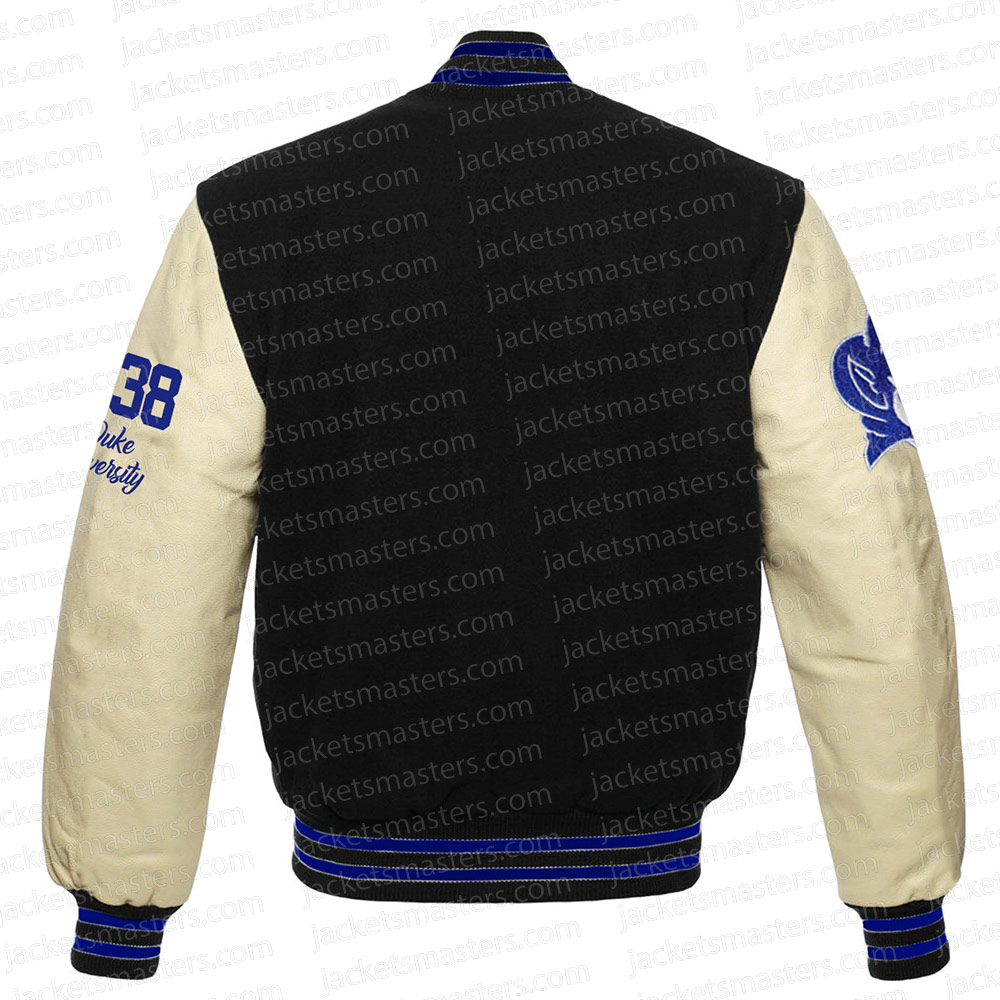 The body of the 1838 Duke Blue Devils Varsity Jacket is made from premium wool, while the sleeves are crafted from genuine leather. This combination not only ensures durability but also delivers a sophisticated edge. The classic black and off-white color palette creates a sleek and versatile look that pairs well with almost any outfit.