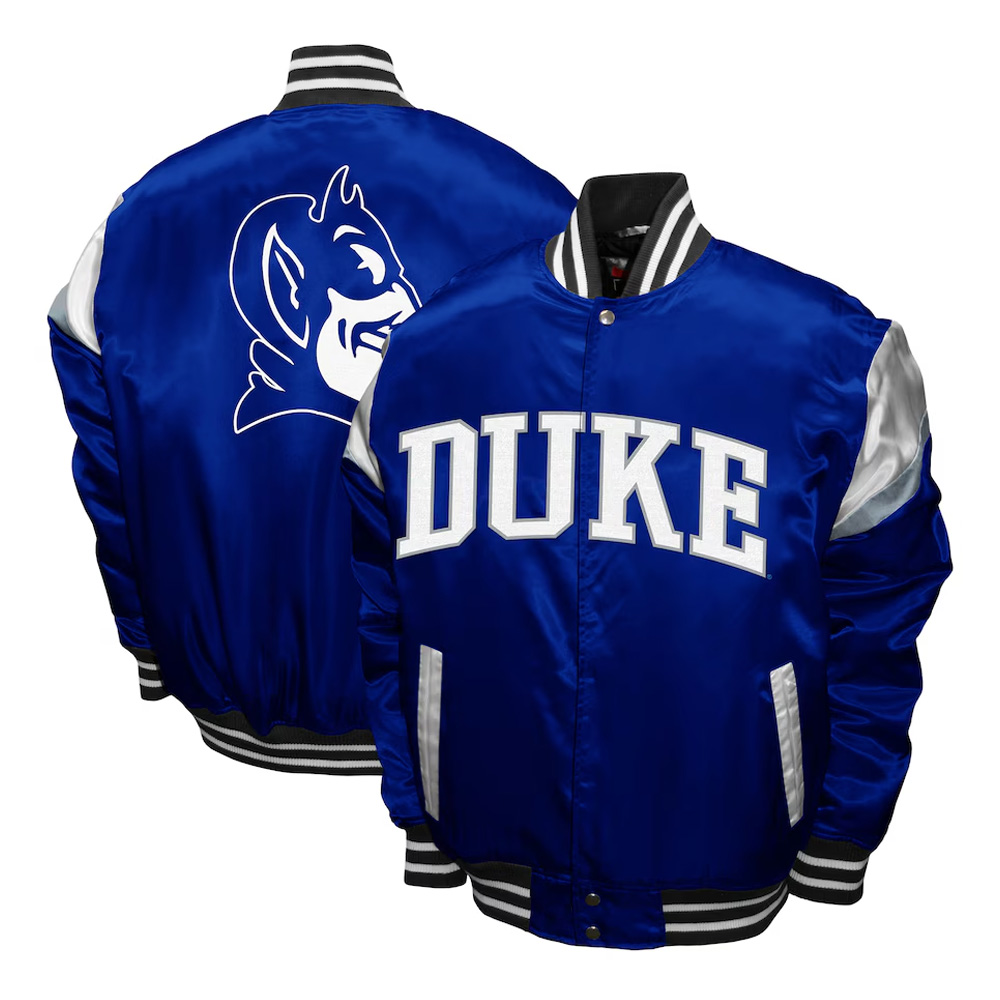 The collar is ribbed for an athletic look that goes well with the having a front zipper with snap placket fastening for a smart and secure fit. The long fitted sleeves have striping for an athletic look that complements the rest of the garment. The cuffs and the bottom of the Kansas Jayhawks Power Powder Royal satin Jacket are ribbed which make it comfortable to wear.