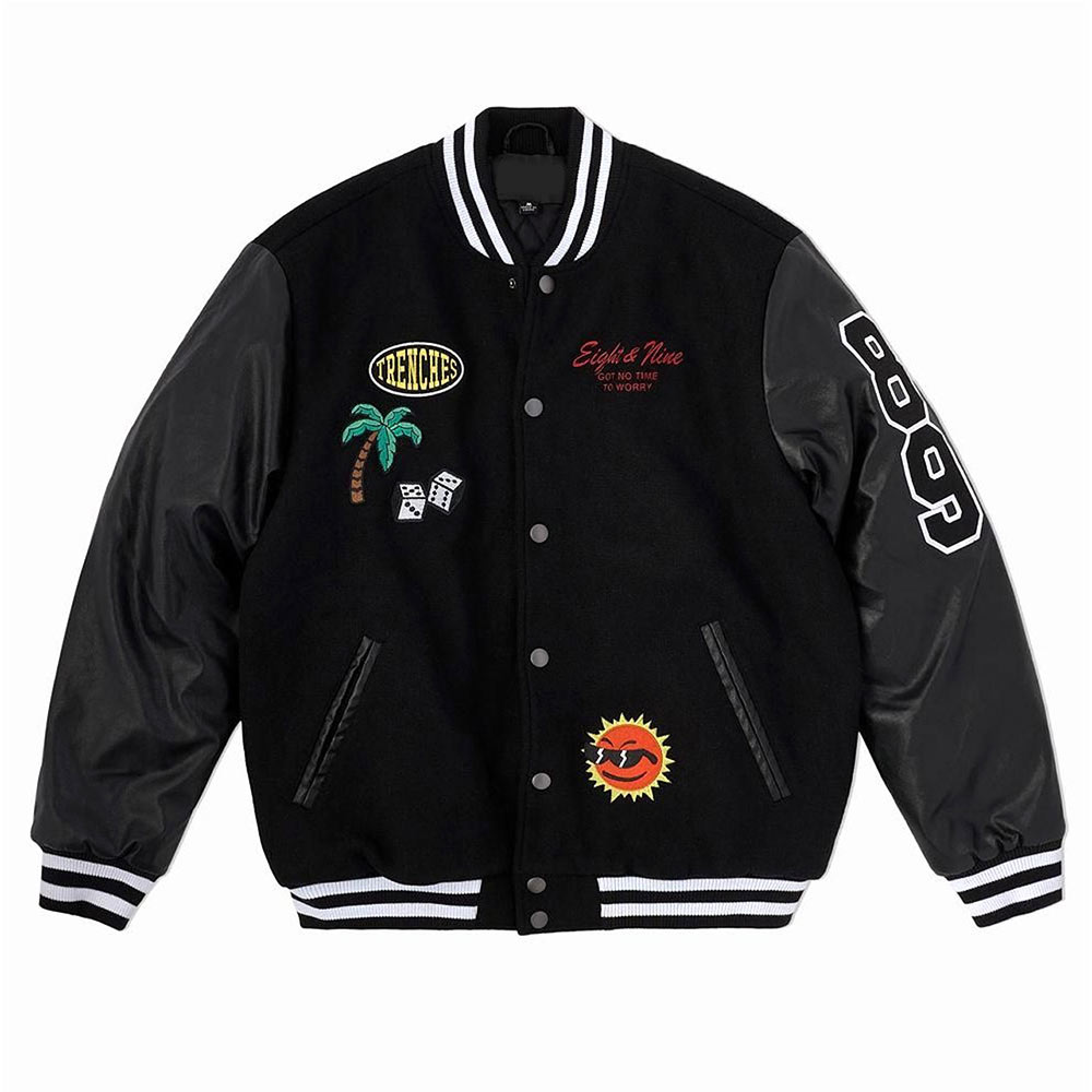 From sleek design to cozier features, the 89 No Worries jacket is a must-have to carry on both casual and special events. Its versatility is shown with the manufacturing as it has a woolen body and genuine leather sleeves providing comfort and durability to both genders. The viscose lining inside lets you perform confidently. Wrapped in a striking black color exuding a sense of depth and mystery. Stay in your comfort zone with its rib-knitted collar, cuffs, and hemline. The snap-tab buttoned closure of the Eight & Nine No Worries letterman jacket allows unrestricted movement. Two waist pockets offer ample storage space. Add this chic to effortlessly elevate your wardrobe having patch of 89 on the sleeve, eight & nine on the back, and embroidered patches on the front