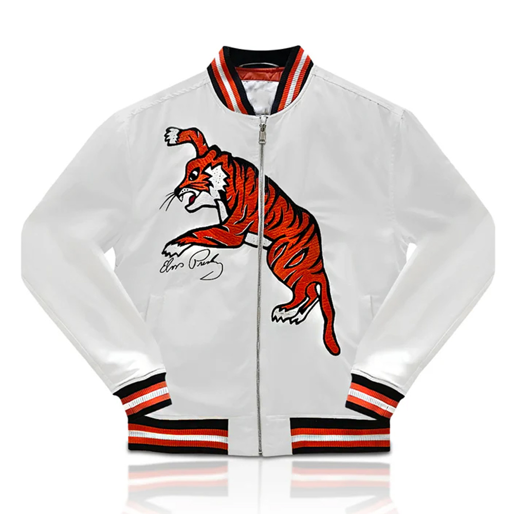 Elvis Presley Tiger White Bomber Full-Zip Satin Jacket