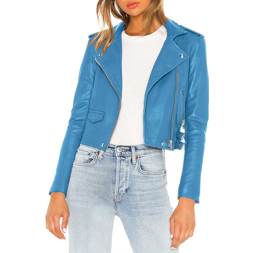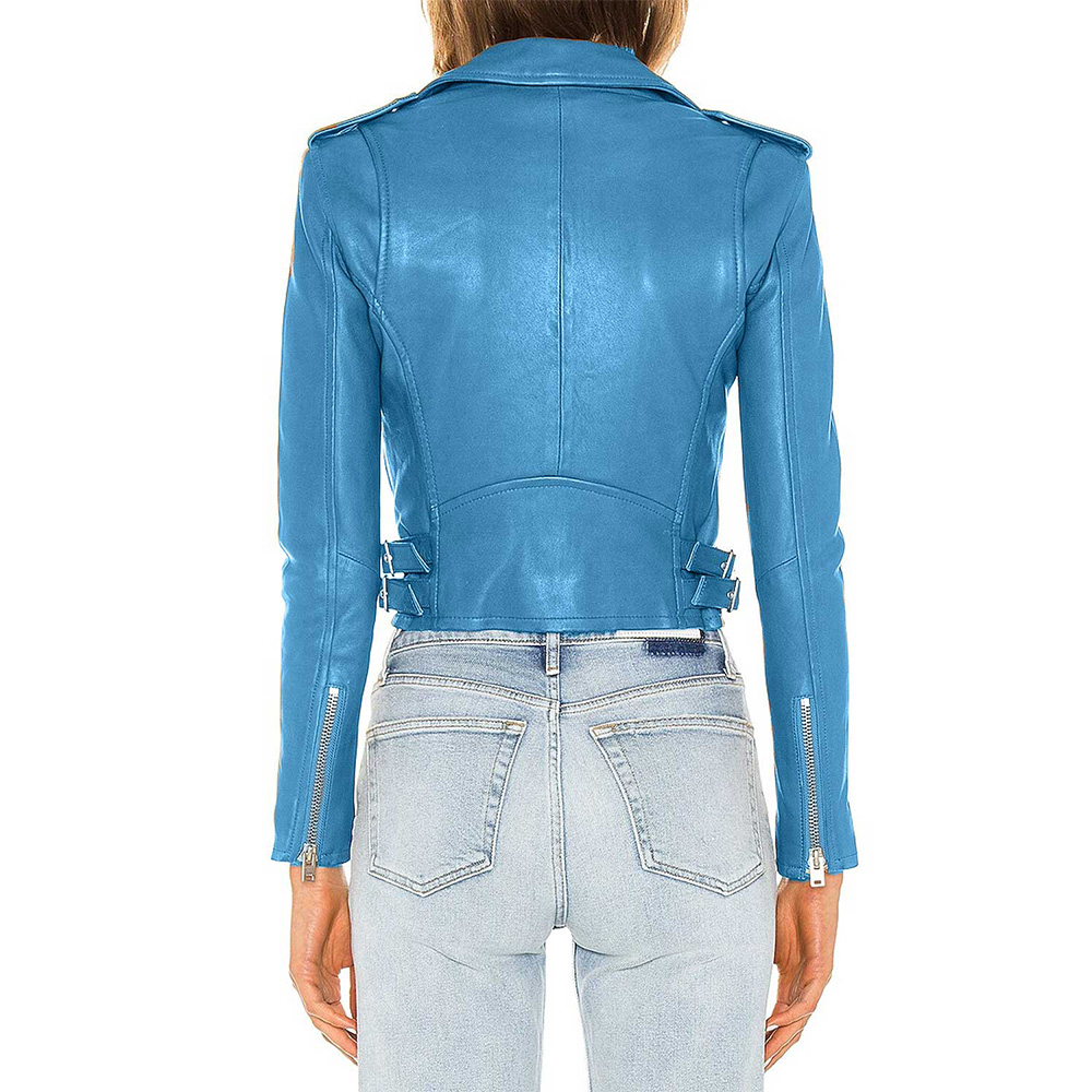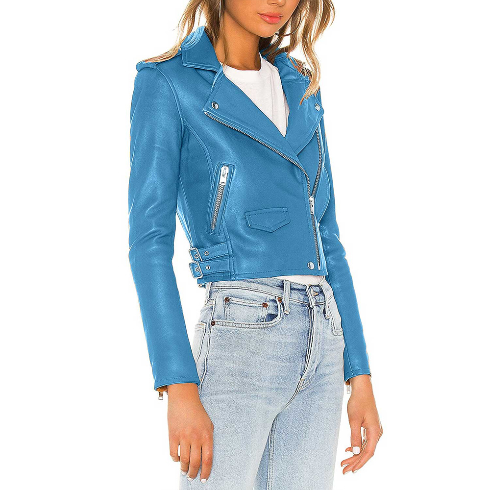 Unleash your style with the Talk Eve Blue Leather jacket, meticulously crafted from premium quality genuine leather. Its glorious blue color creates an innovative and attractive visual appeal that is simply stunning look. This Eve the Talk Blue Leather jacket features a classic lapel style collar and a branded YKK zipper front closure, marrying elegance with convenience. The soft viscose inner lining guarantees warmth and relaxation, while the long sleeves with zipper cuffs provide a comfortable and refined fit. With two inner and two side pockets, this Talk Eve Blue Leather jacket offers practicality and functionality. The fine quality stitching ensures both comfort and desirability, making it an ideal choice for parties and events.