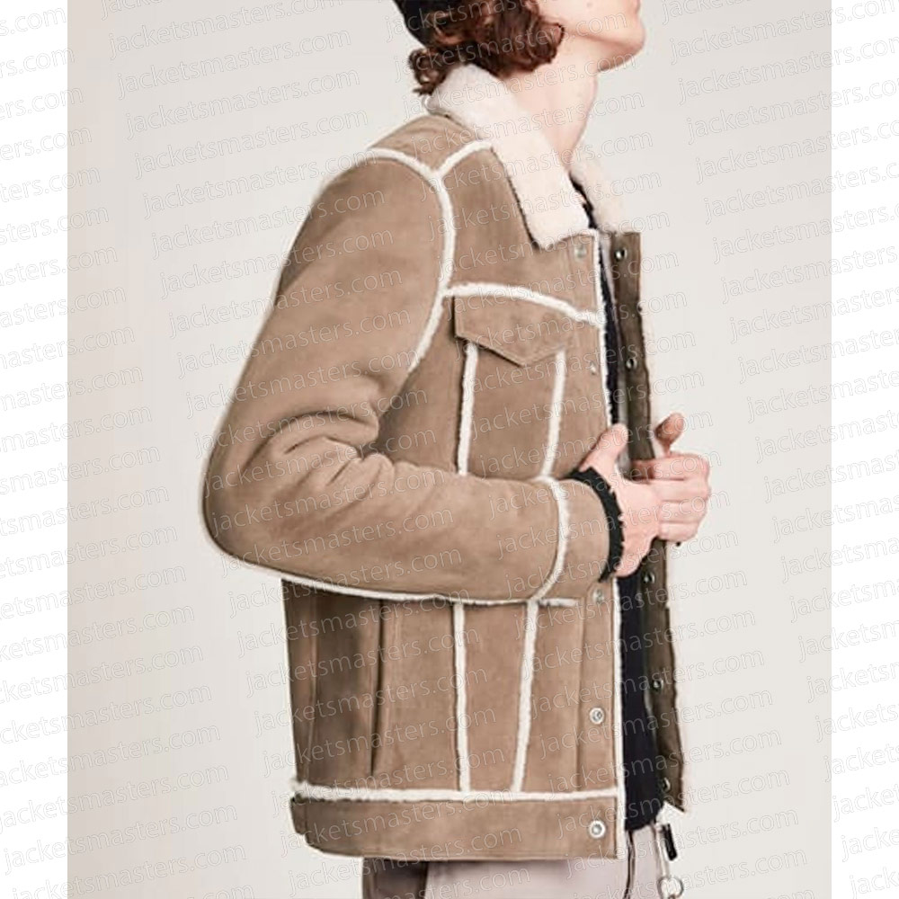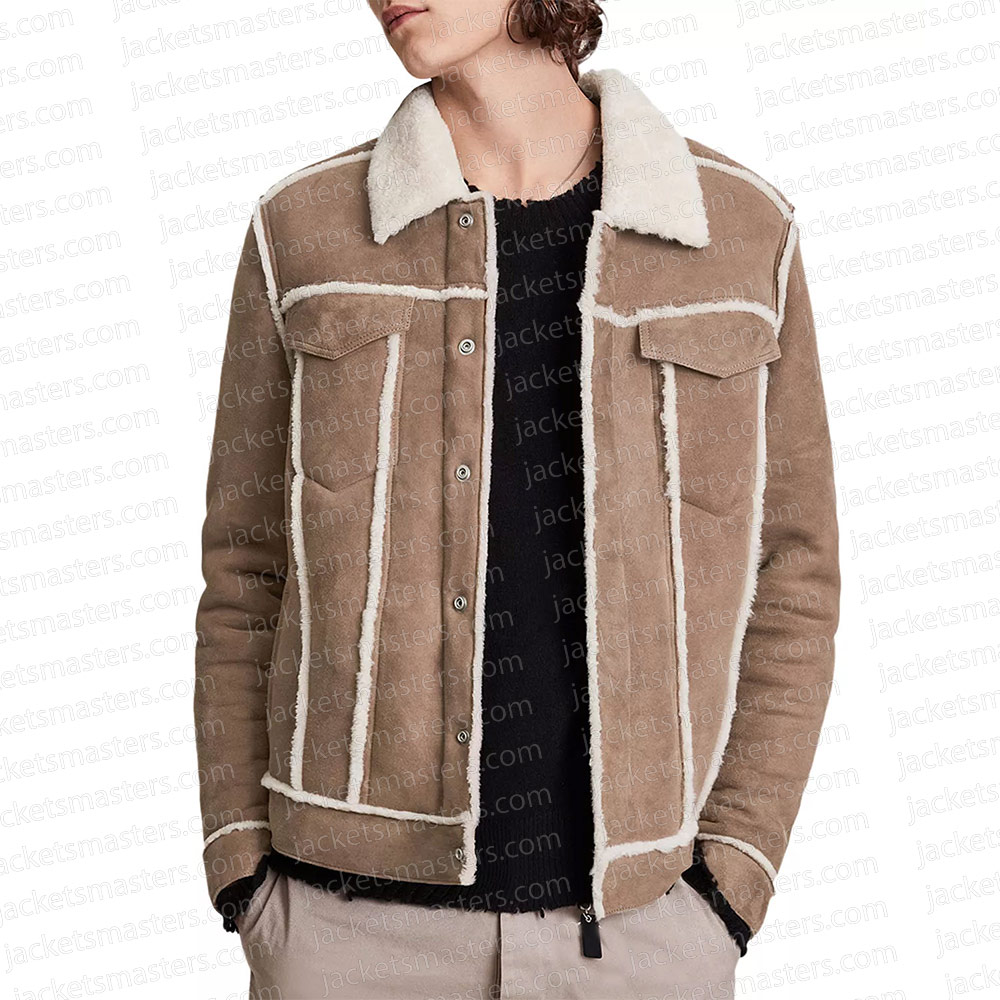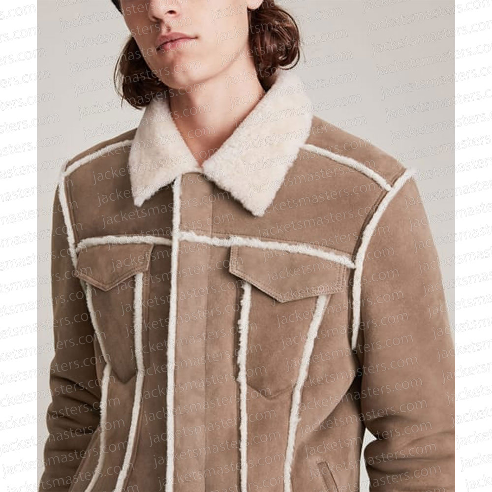 Crafted from the finest quality wool blend the Evil Season 3 Ben Shakir jacket exudes sophistication crafted from premium quality suede leather. Its majestic beige color adds an innovative and enchanted touch. The shirt style collar enhances its timeless appeal. With buttoned front closure, this Evil Aasif Mandvi Trucker jacket is effortlessly stylish. Stay warm and relaxed with the soft viscose inner lining. The long sleeves with open hem cuffs exude elegance. Stay organized with one inside and two outside pockets. Fine quality stitching of Evil Season 3 Ben Shakir jacket ensures durability and comfort. Embrace a sleek and alluring style that sets you apart from the crowd. Step out in this catchy and unique coat that commands attention.