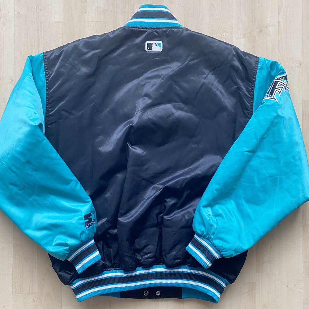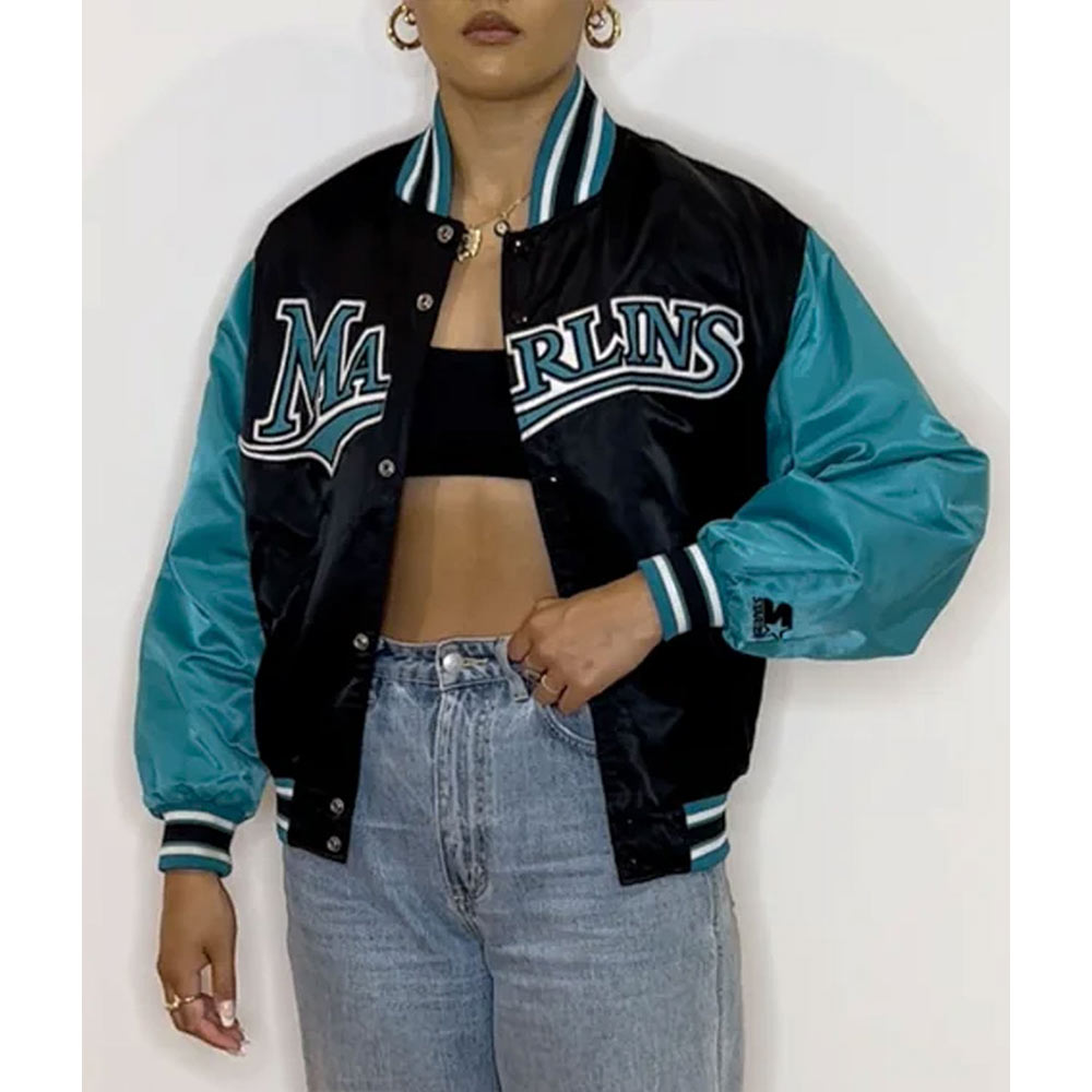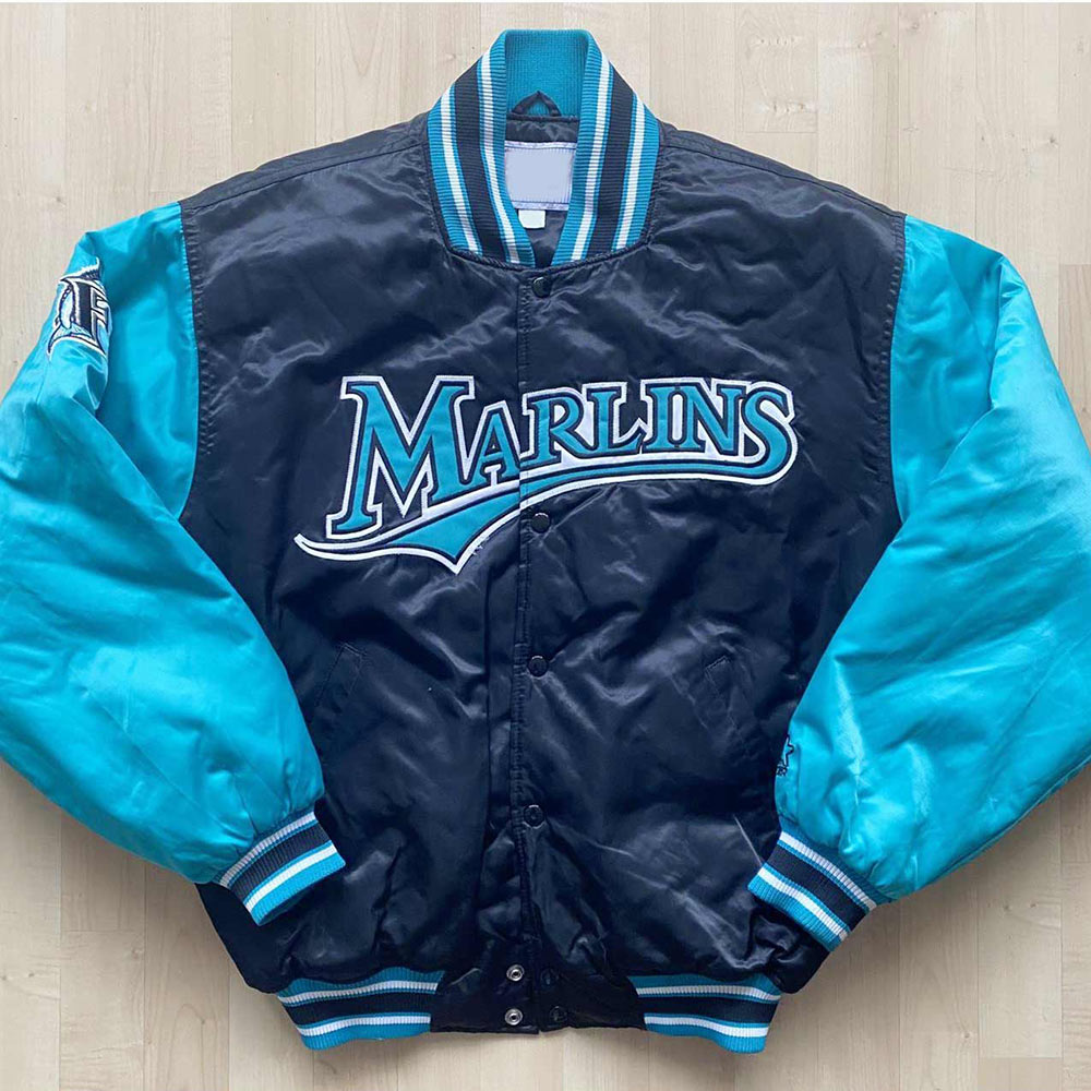 This jacket is made of satin and has an exquisite shiny appearance that is hard to overlook. It is comfortable and stylish. The viscose lining adds a touch of luxury and guarantees that the garment’s feel against your body is pleasant. The style—navy blue with black accents—is a direct homage to the Florida Marlins and is definitely loud in the best possible way.