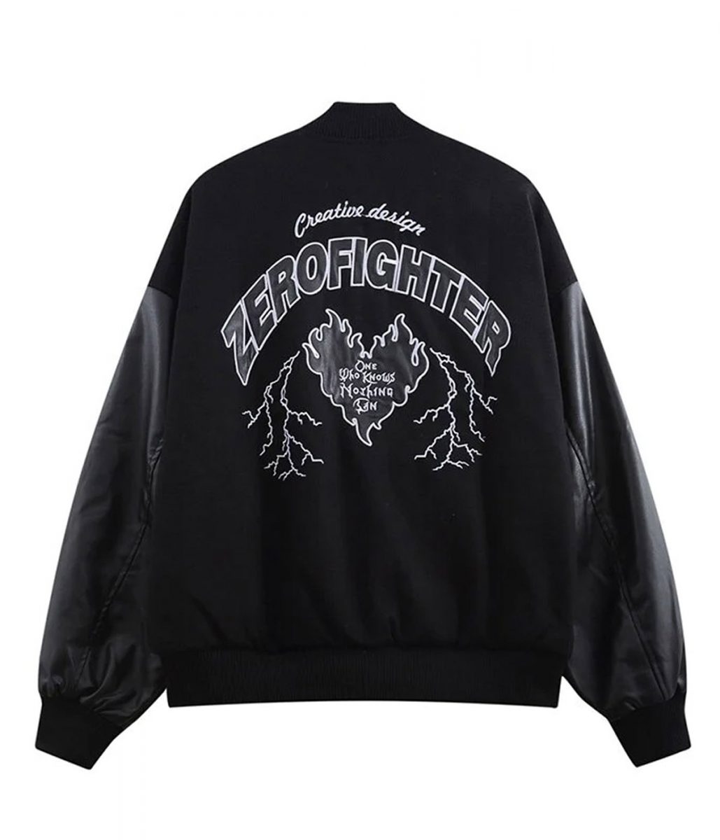 Zero Fighter Forget Black Embroidery Baseball Varsity Jacket