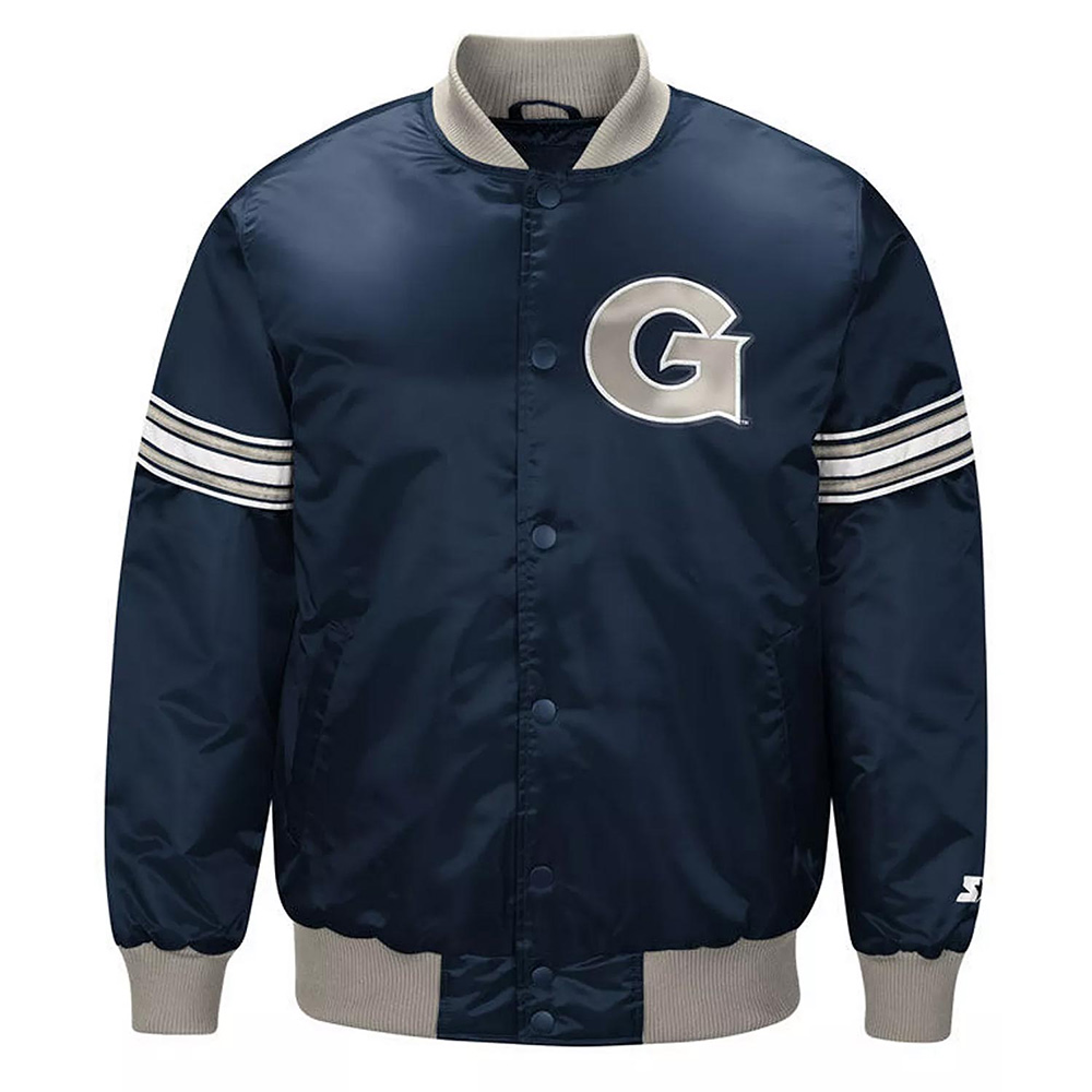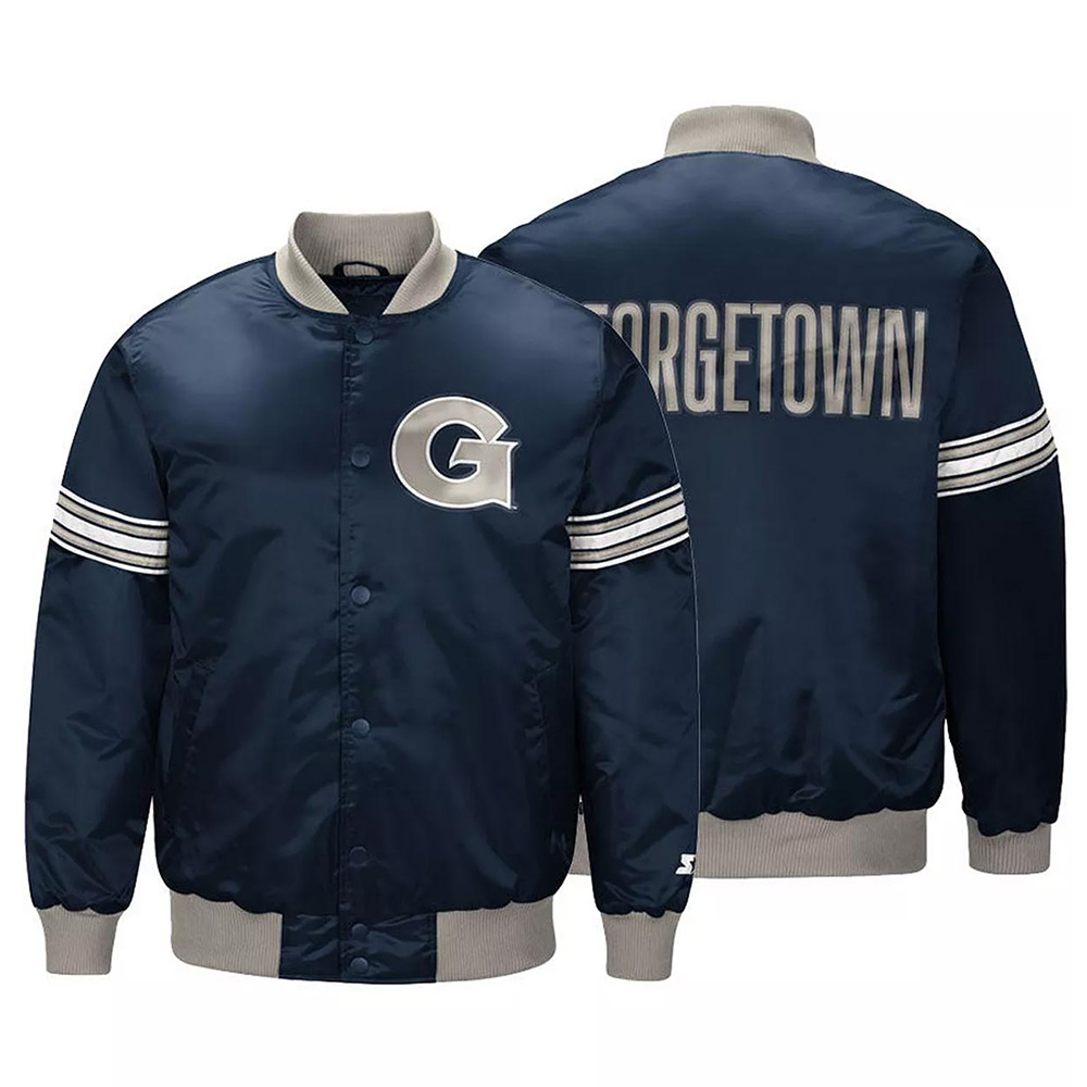 The Georgetown Hoyas Draft Pick jacket is made up of high-quality satin. The jacket is available in a glorious navy blue color, which gives it an innovative and attractive look. The jacket has shirt style collar. The jacket has branded YKK zipper front closure. A soft inner viscose lining of the jacket keeps you warm and relaxed. The sleeves of Georgetown Hoyas Draft Pick Navy Blue Satin jacket are long with rib knitted cuffs. The jacket has two inner and two side pockets. The fine quality stitching Georgetown Hoyas Draft Pick jacket durable and desirable to wear. The jacket is an ideal choice to wear in parties.