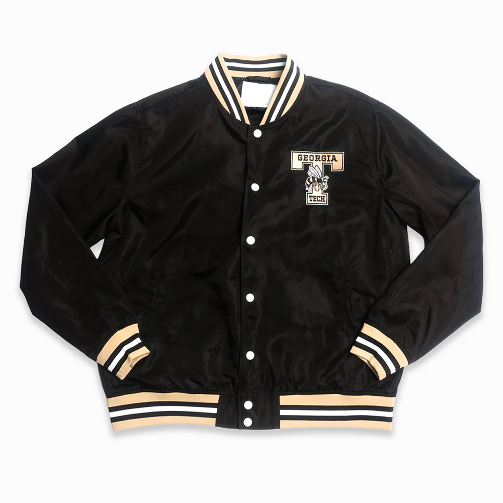 Introducing our versatile and stylish Script Georgia Tech Jacket, a unisex fashion statement suitable for all genders. Crafted from high-quality satin material, this jacket exudes a sleek and sophisticated vibe. The Viscose lining ensures comfort, making it a perfect choice for various occasions. Available in a timeless black color, this jacket effortlessly complements any wardrobe. The snap tab buttoned closure, rib-knitted striped collar, cuffs, and waistband add a sporty touch while maintaining a refined look. Fine stitching attests to the jacket’s quality craftsmanship. With two convenient waist pockets, practicality meets style. The standout feature is the Georgia Tech Script logo embellishing both the front and back, showcasing your team spirit in a fashionable way. Elevate your ensemble with this premium jacket that seamlessly combines comfort, style, and team pride. Whether you’re cheering on your team or making a fashion statement, this Georgia Tech Script Black Bomber Jacket is the perfect choice.