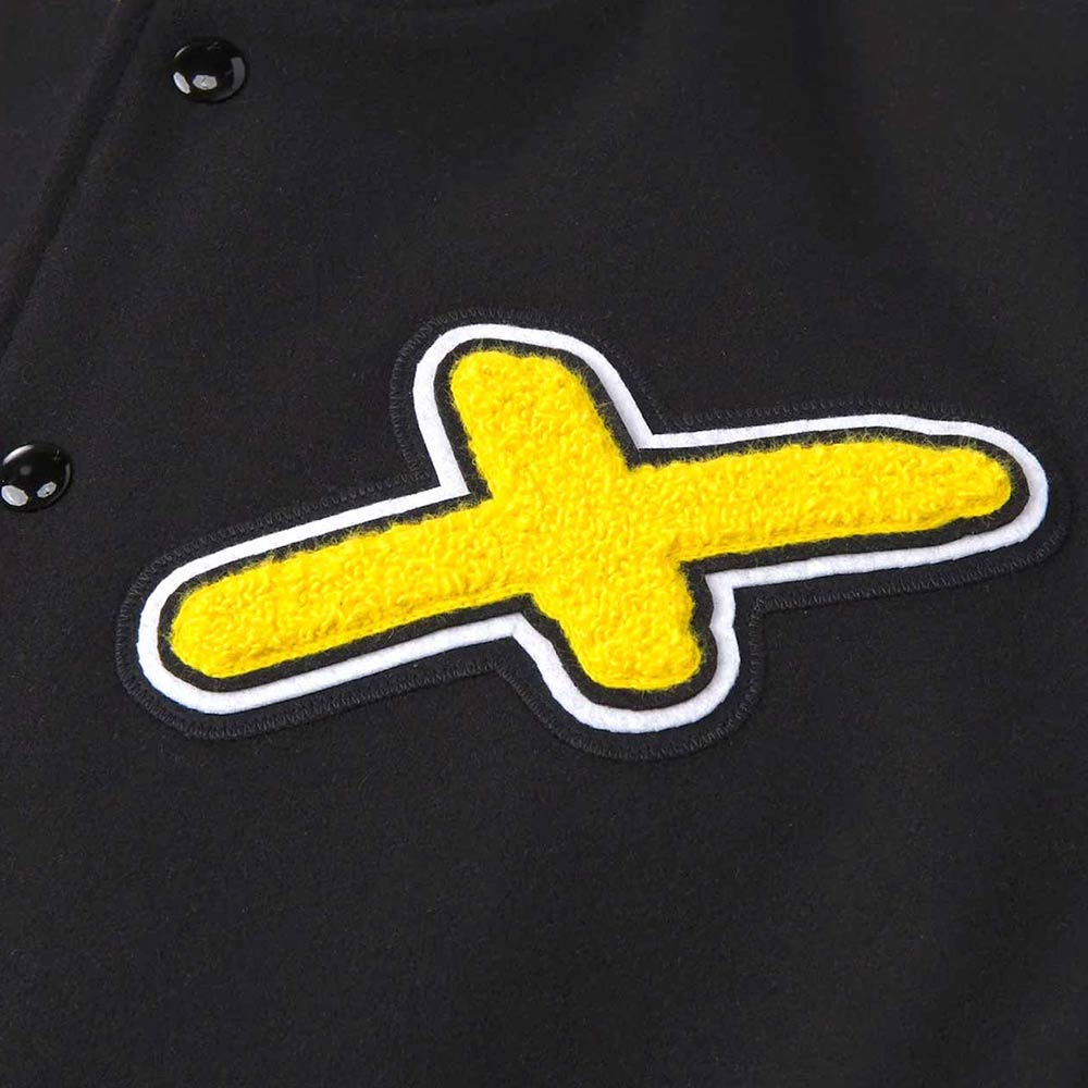 The jacket is presented in a sleek black hue, exuding an air of understated luxury and versatility. The snap tab buttoned closure at the front provides a seamless and stylish finish, accentuated by the distinctive rib-knitted striped collar, cuffs, and hemline. The long sleeves, adorned with rib-knitted striped cuffs, offer a snug fit and a refined silhouette. Fine stitching details accentuate the jacket’s impeccable craftsmanship, ensuring durability and longevity. The pièce de résistance is the stunning Golden Bear Pikachu logo, elegantly displayed on the front, back, and sleeve, adding a playful yet sophisticated touch to this exceptional piece.