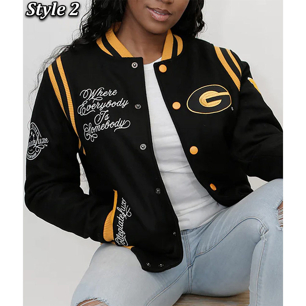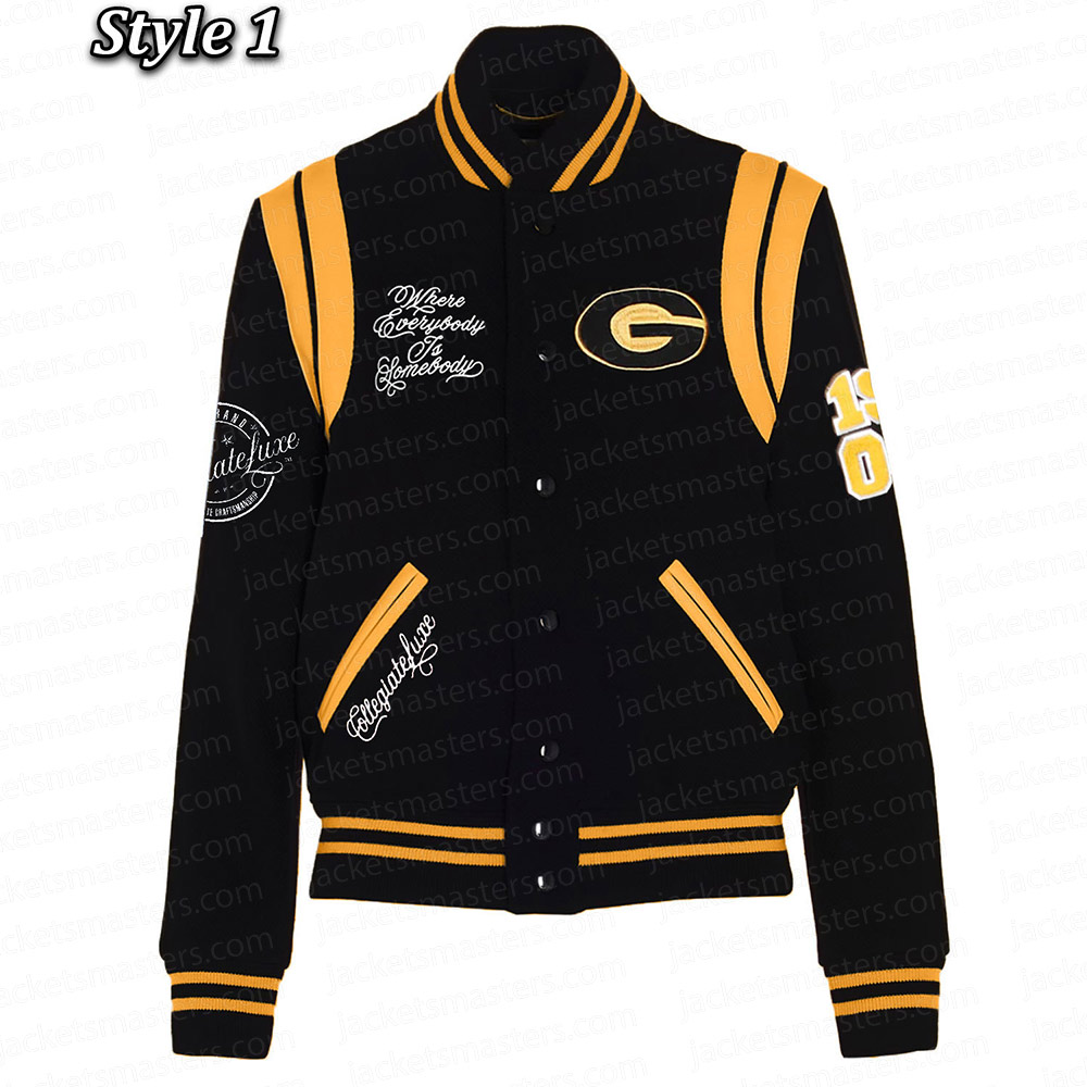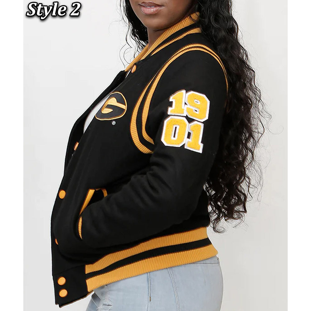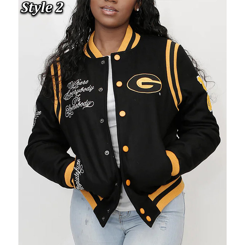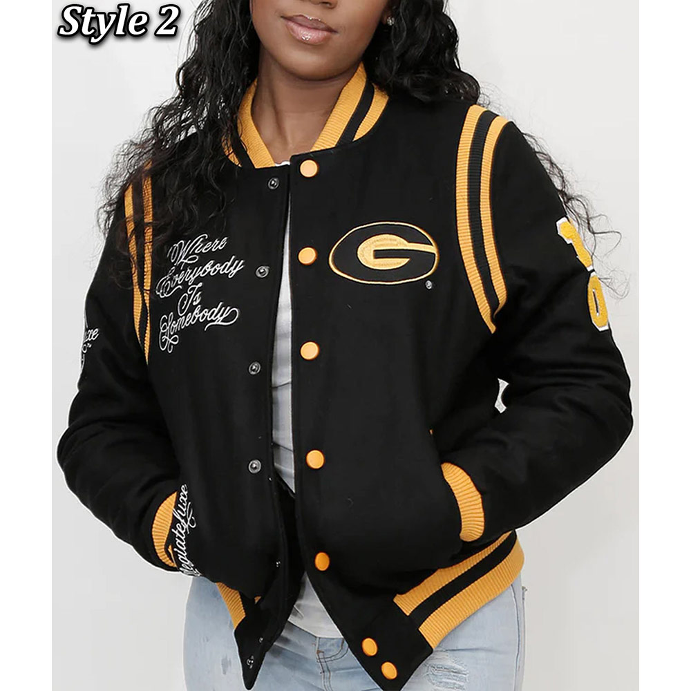 Adorn yourself with the Grambling State Black Varsity Jacket, meticulously crafted from premium wool. Adorned in a captivating black shade, this jacket exudes versatility fit for any occasion. The Grambling State University Varsity Jacket showcases a rib-knitted collar and a front buttoned closure, accompanied by a rib-knitted hemline, ensuring ease of wear. Enhanced by logos gracing the front, back, and sleeves, it boasts an unparalleled aura. The jacket’s inner lining, composed of luxuriously soft viscose, envelops you in comfort and warmth. With sleeves tailored for a snug fit and finished with rib-knitted cuffs, it harmonizes style and coziness. Two side waist pockets offer functionality for your essentials. Meticulous craftsmanship guarantees enduring quality, rendering the Grambling State Black Varsity Jacket the epitome of enduring style for both fashion-forward men and women.