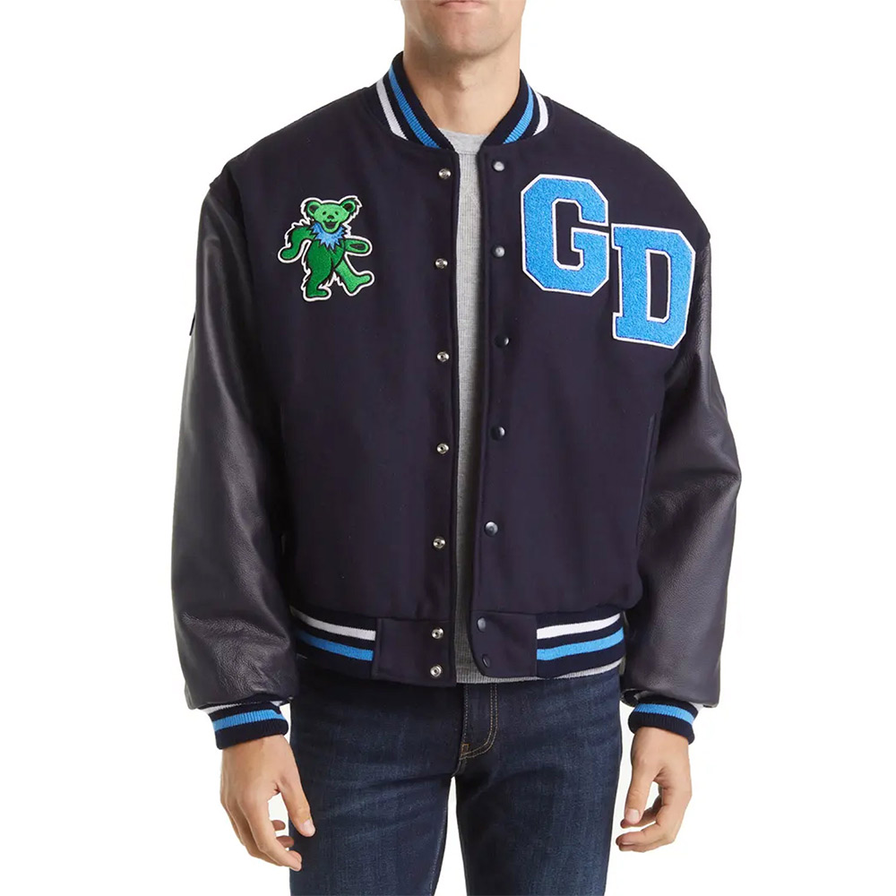 Embrace iconic style with the Grateful Dead High Varsity Jacket, expertly tailored from plush wool and adorned with genuine leather sleeves. Presented in a subdued blue shade, this jacket exudes modern sophistication. The Grateful Dead Varsity Jacket features a rib-knitted collar, buttoned closure, and rib-knitted hemline, seamlessly blending comfort and style. Adorned with meticulously appliqued patches on the front and back, it attains an unparalleled allure. Wrapped in a gentle viscose lining, the inner cocoon envelops you in warmth and comfort. The elongated, form-fitting sleeves, complete with rib-knitted cuffs, ensure a sleek silhouette. For convenience and flair, two side waist pockets elegantly integrate functionality. Unyielding stitching guarantees the jackets lasting durability. A choice cherished by stylish men and women, the Grateful Dead High Varsity Jacket stands as a testament to iconic fashion, perfect for a casual night out.