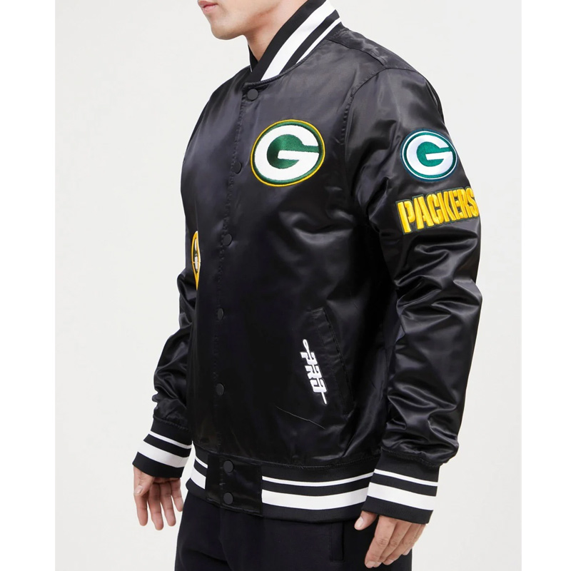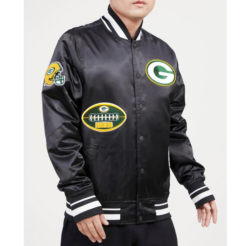 This fashionable Green Bay Packers Old English Classic Rib Satin Jacket features authentic Green Bay Packers team patches on elongated sleeves which create a retro appearance while keeping the style future-forward. Snapping closure at the front simplifies donning and the two pockets near the waist and two pockets inside provide sufficient storage space.