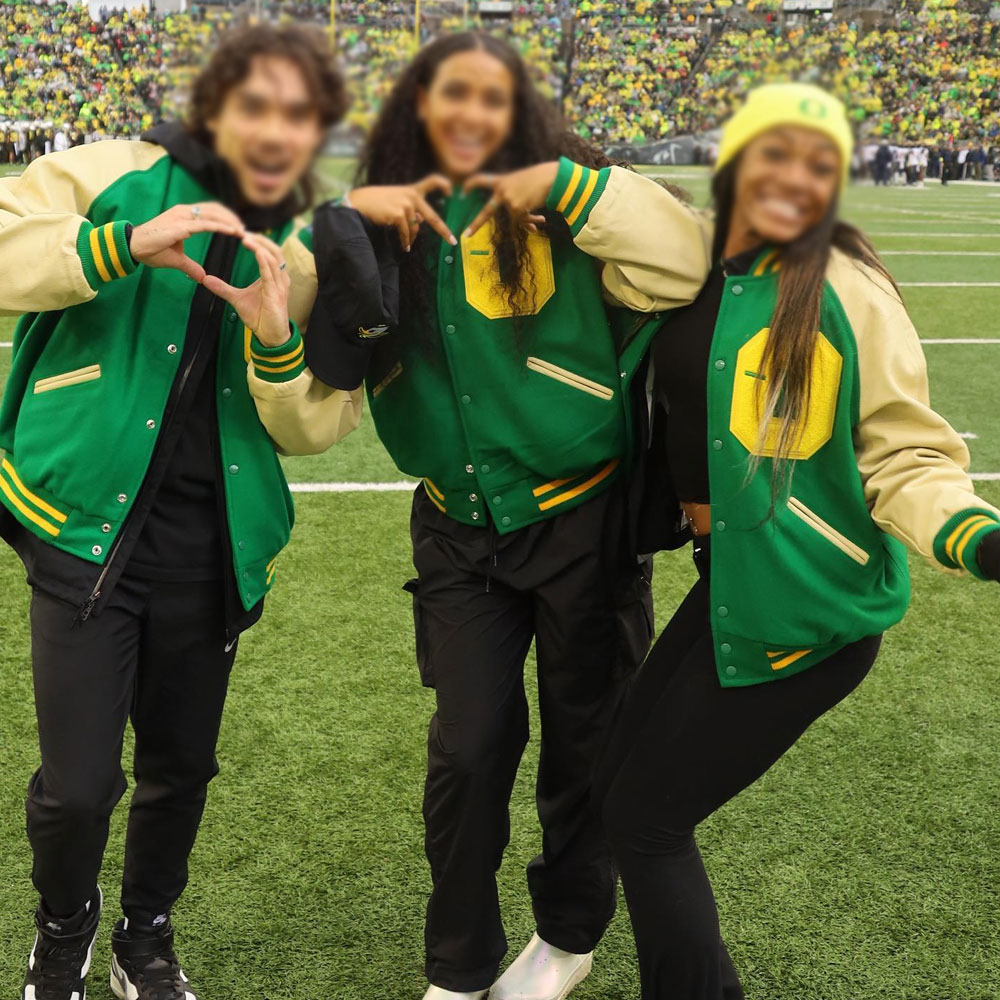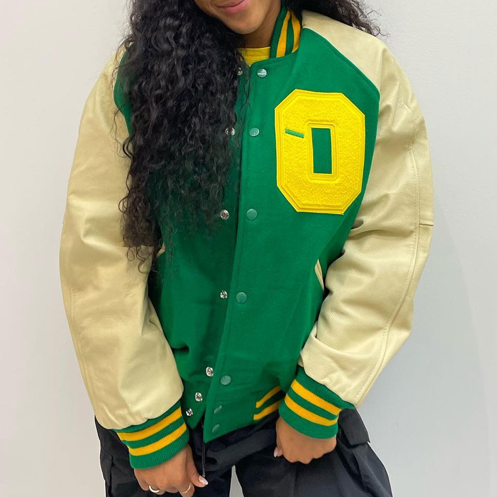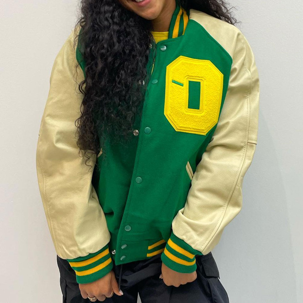 Unveiling the exceptional Green O Letterman jacket Meticulously crafted body made wool and sleeves made from genuine leather. Immerse yourself in its majestic green color, radiating innovation and unmatched dazzle. The rib knitted collar adds a touch of style that sets you apart. Experience the classic snap tab buttoned front closure, embodying timeless elegance. Indulge in the soft viscose inner lining, keeping you warm and luxuriously comfortable. The full-length sleeves of Green O Varsity jacket tailored to perfection, enhance your sophistication. Discover the convenience of two side waist pockets, keeping your essentials close at hand. Impeccable stitching ensures durability and guarantees a comfortable wear. Elevate your party attire with the ultimate choice in style and captivation. Embrace the uniqueness of the Green O Letterman jacket, meticulously designed to maintain its length for an impeccable fit.